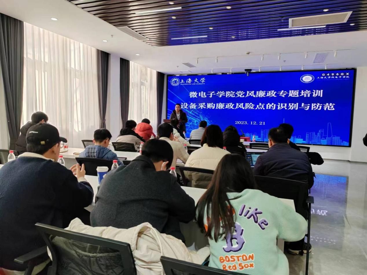 为深入推进全面从严治党,强化教职工廉洁自律意识,努力营造干事创业、风清气正的政治生态,12月21日,微电子学院党委在A楼101会议室开展设备采购廉政风险点的识别与防范党风廉政建设专题培训。微电子学院党委书记郭纯生,党委副书记、副院长、纪检员袁铭,副院长周婷,以及学院学科团队负责人、新进教师、行政管理人员参加培训。培训由袁铭主持。