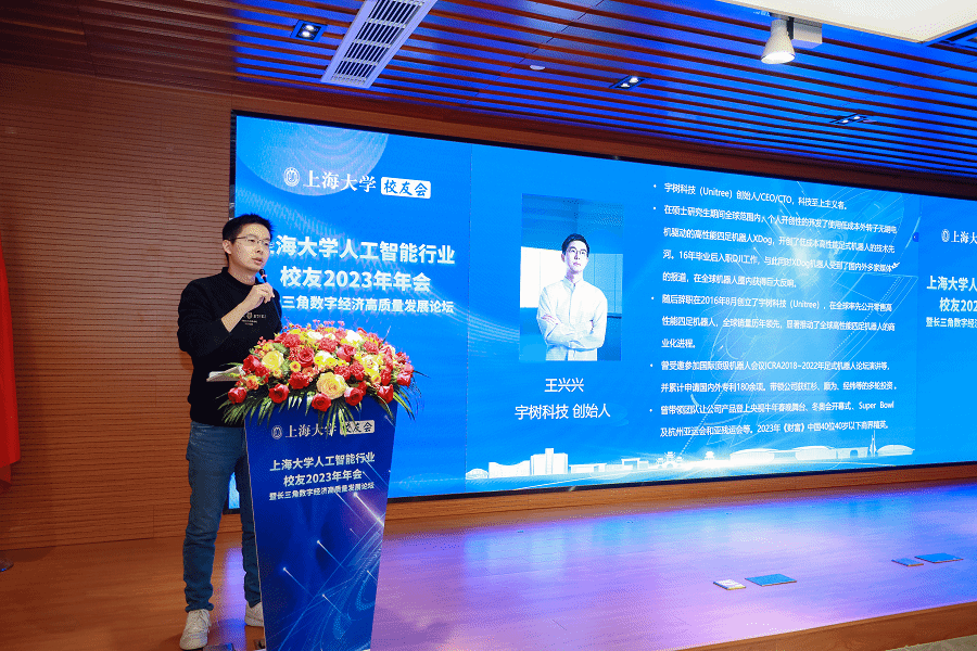 主题分享环节,上海大学未来技术学院副院长岳晓冬带来了关于机器学习前沿进展的报告分享;上海华力微电子有限公司市场部部长张亮介绍了芯片的应用场景;上海爱餐机器人(集团)有限公司董事长、1986届校友何青分享了机器人在餐饮行业内的应用;新加坡国立大学讲师顾瞻、2004届校友以线上形式分析了人工智能在商业领域的应用情况及中、西方机遇与挑战;杭州宇树科技创有限公司创始人兼CEO、2016届校友王兴兴分享了团队开创全球领先、低成本高性能足式机器人的创业过程;上海韶脑传感技术有限公司创始人、上海大学教授杨帮华介绍了脑机接口技术在医疗及康复上的应用;上海大学计算机工程与科学学院教授、博士生导师余航带来了关于大型语言模型的主题分享。