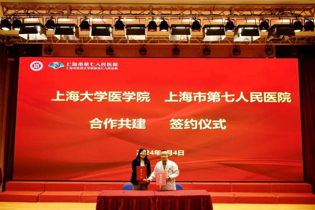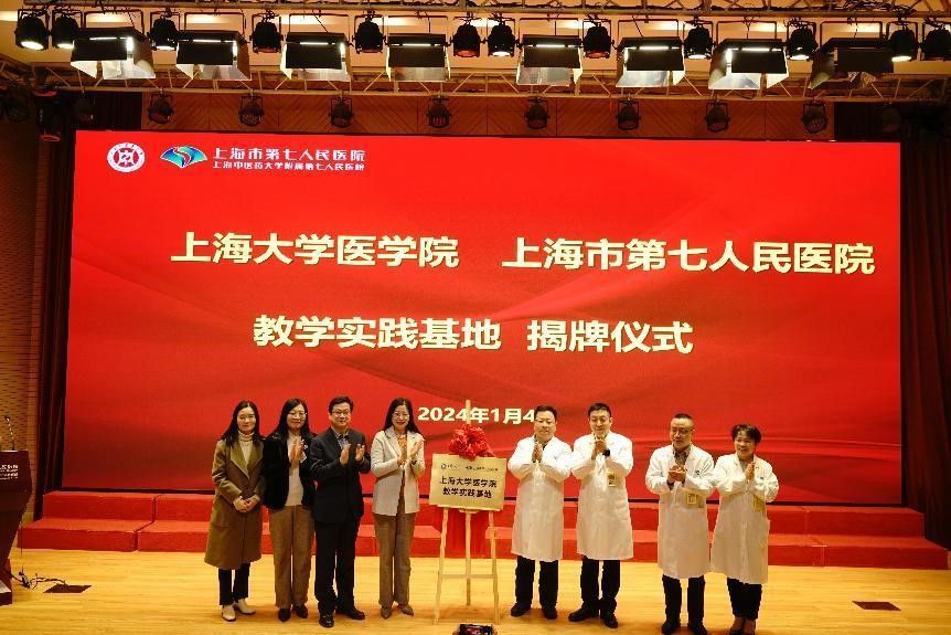2024年1月4日,上海大学医学院与上海市第七人民医院签订战略合作框架协议并举行上海大学医学院教学实践基地揭牌仪式。上海市第七人民医院党委书记成就,院长禹宝庆,副院长胡聃;上海大学医学院党委书记李娟,院长刘斌,副院长姚萱,党委副书记、副院长盛晓娜等党政领导及相关人员出席。仪式由禹宝庆院长主持。