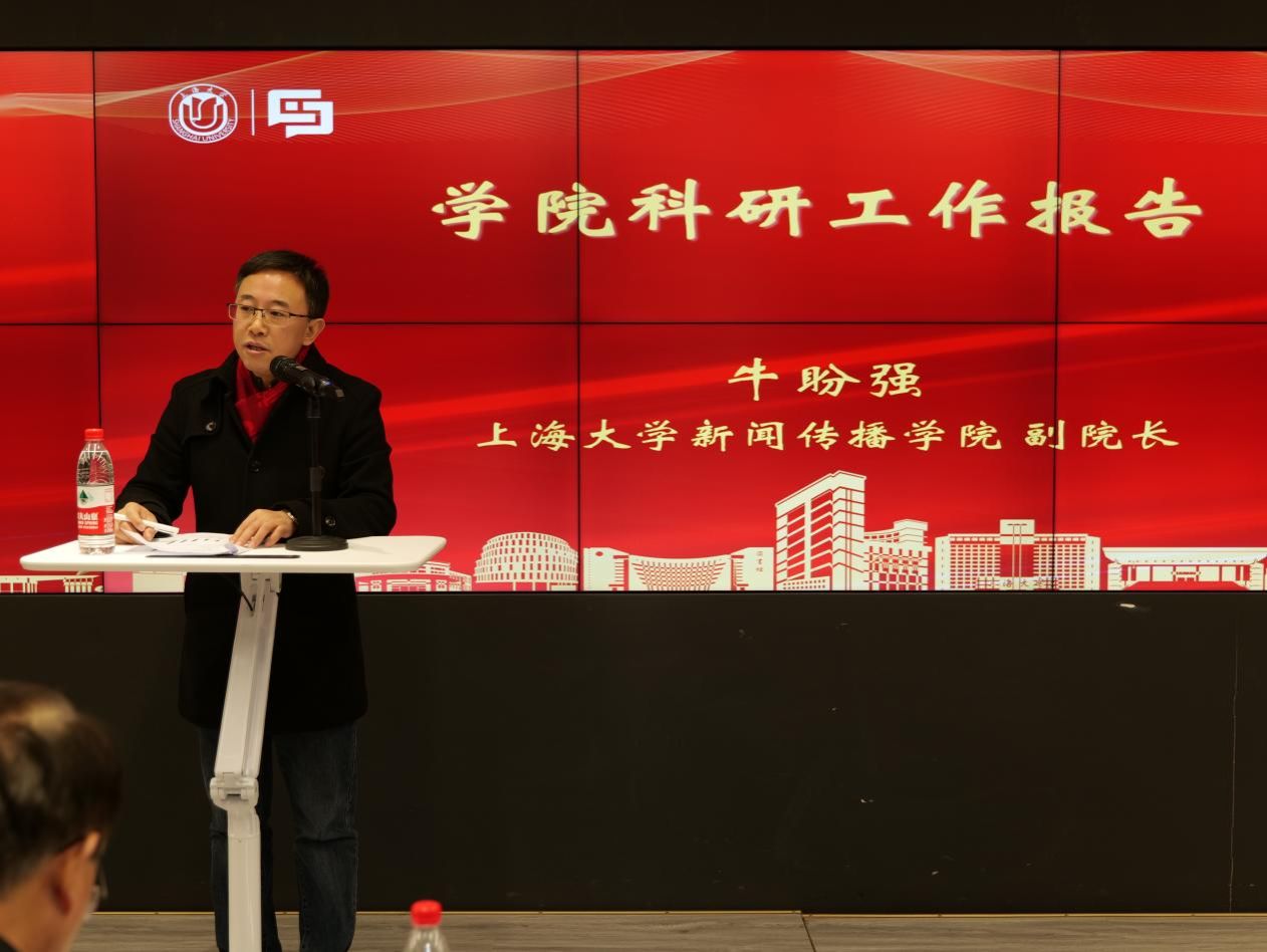 新闻传播学院副院长牛盼强做了上海大学新闻传播学院科研工作报告。报告指出学院近五年科研发展有以下几个特点:论文发表迈上新台阶,科研项目与经费取得跨越式增长,科研获奖喜中有忧,智库建设开创新局面,艺术创作有新亮点,学术机构建设迈上新台阶,学术交流取得积极成效,自身建设不断加强。未来,学院科研创新发展的指导思想是:以习近平新时代中国特色社会主义思想为指导,深入贯彻党的二十大精神,按照上海大学“五五战略”(五朵金花、五大阵地)布局要求,基于学院科研已经进入发展新阶段的院情研判,坚持以马克思主义新闻观为引领,以国家和上海重大需求为目标,瞄准智能媒体传播发展前沿,利用好“本土化”与“国际化”两种资源,发挥好“有组织的科研”与“自由探索”两种模式,通过构建面向中国式现代化的新闻传播学科创新,推动学院科研高质量发展。科研创新目标是:通过下一个五年的努力奋斗,学院的科研管理体系与治理能力日趋完善,科研软硬件设施和科研氛围得到根本改善,教师的科研意识、科研水平和创新能力不断提高,国家级甚至世界级的高质量科研成果和奖励不断涌现,形成国内新闻传播科研高地与标杆,在国际新闻传播学术研究领域形成一定影响力。并提出了学院科研创新发展的七条具体举措。