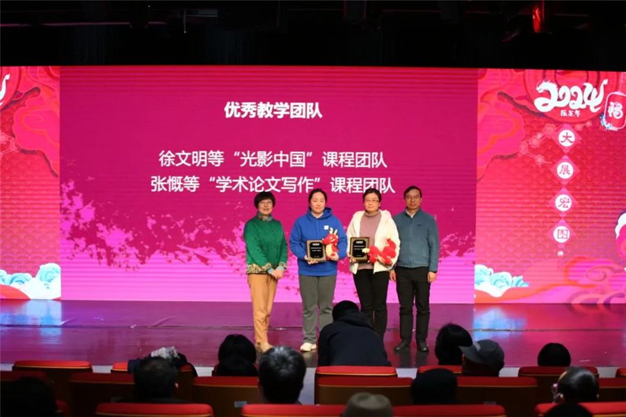 上海大学教务部副部长、教育部课程思政教学研究示范中心负责人(上海大学)顾晓英教授与张斌副院长一起为学院教学创新标兵、优秀教学团队颁奖。