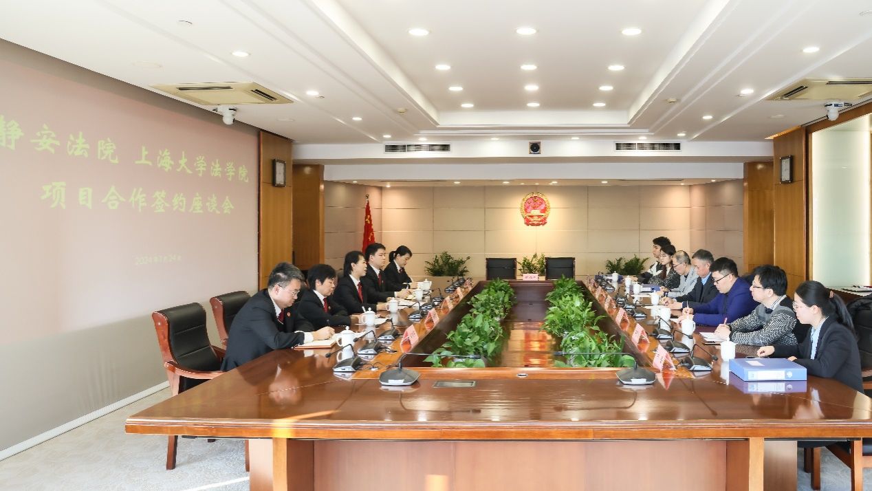 1月24日下午,为加强院校合作,进一步探索法学教育与法律职业有机衔接的实践路径,共育高素质法治人才,上海大学法学院党委副书记、院长李凤章,法学院党委副书记、副院长于伟,学院学科建设与对外联络办公室主任贺斌、法学院金融裁判与执破融合研究中心主任王梦飞等赴上海市静安区人民法院参加静安法院与上海大学法学院项目合作签约座谈会。