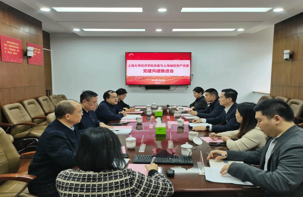 2024年1月29日下午,上海城投资产管理(集团)有限公司一行至上海大学经济学院开展党建共建工作交流研讨。上海城投资产党委书记、董事长黄建刚,党委副书记严育新,党委组织部(人力资源部)部长杨慧慧,党委组织部(人力资源部)成柠茜,城投资产交流锻炼干部赵安康;经济学院党委书记孟添,党委副书记、副院长冯玉鑫,上海市软科学研究基地-上海科技金融研究所研究总监祝波,金融系教师、交流锻炼干部任桂,学院党委组织员范春艳参加本次会议。会议由冯玉鑫主持。