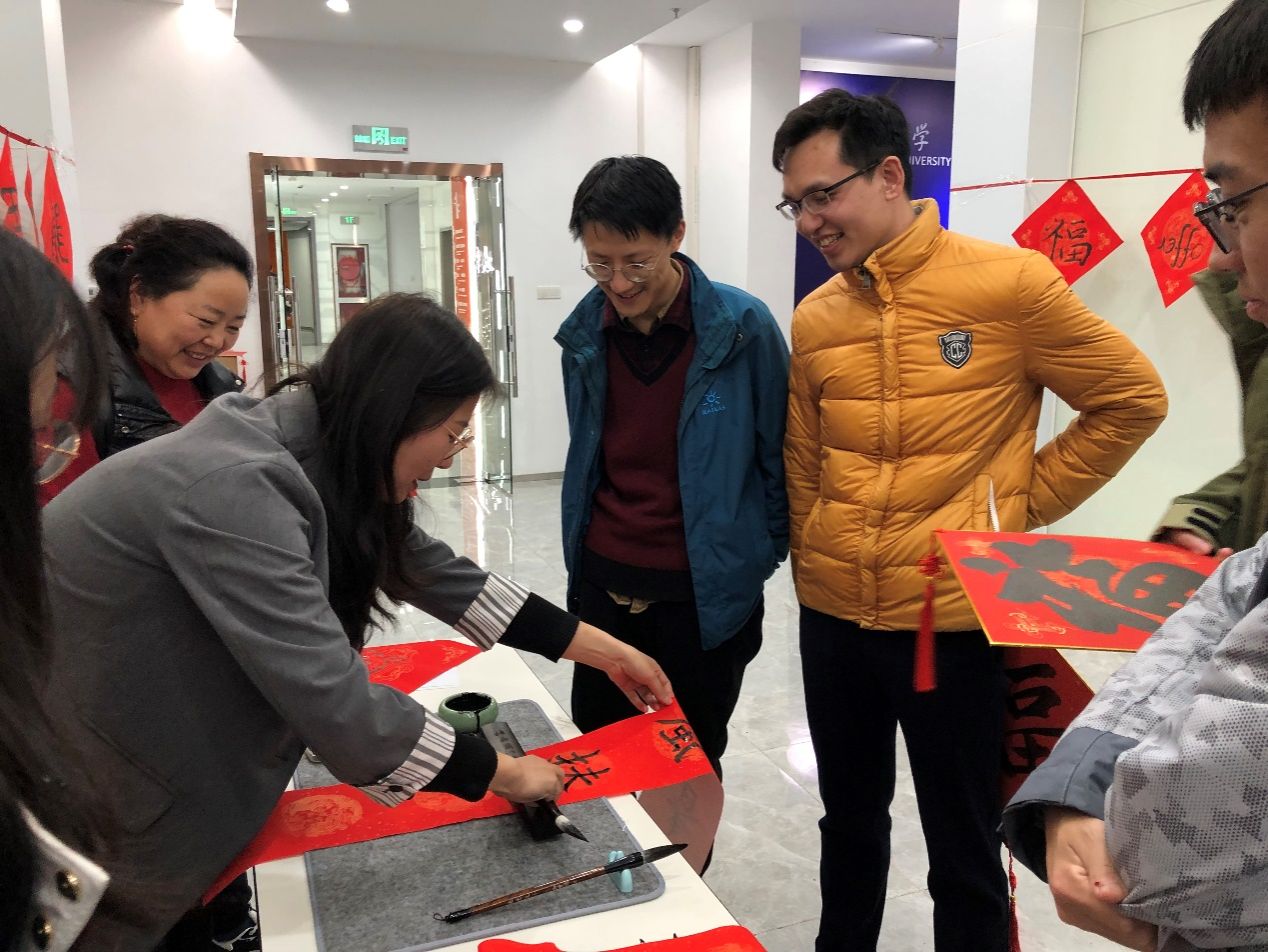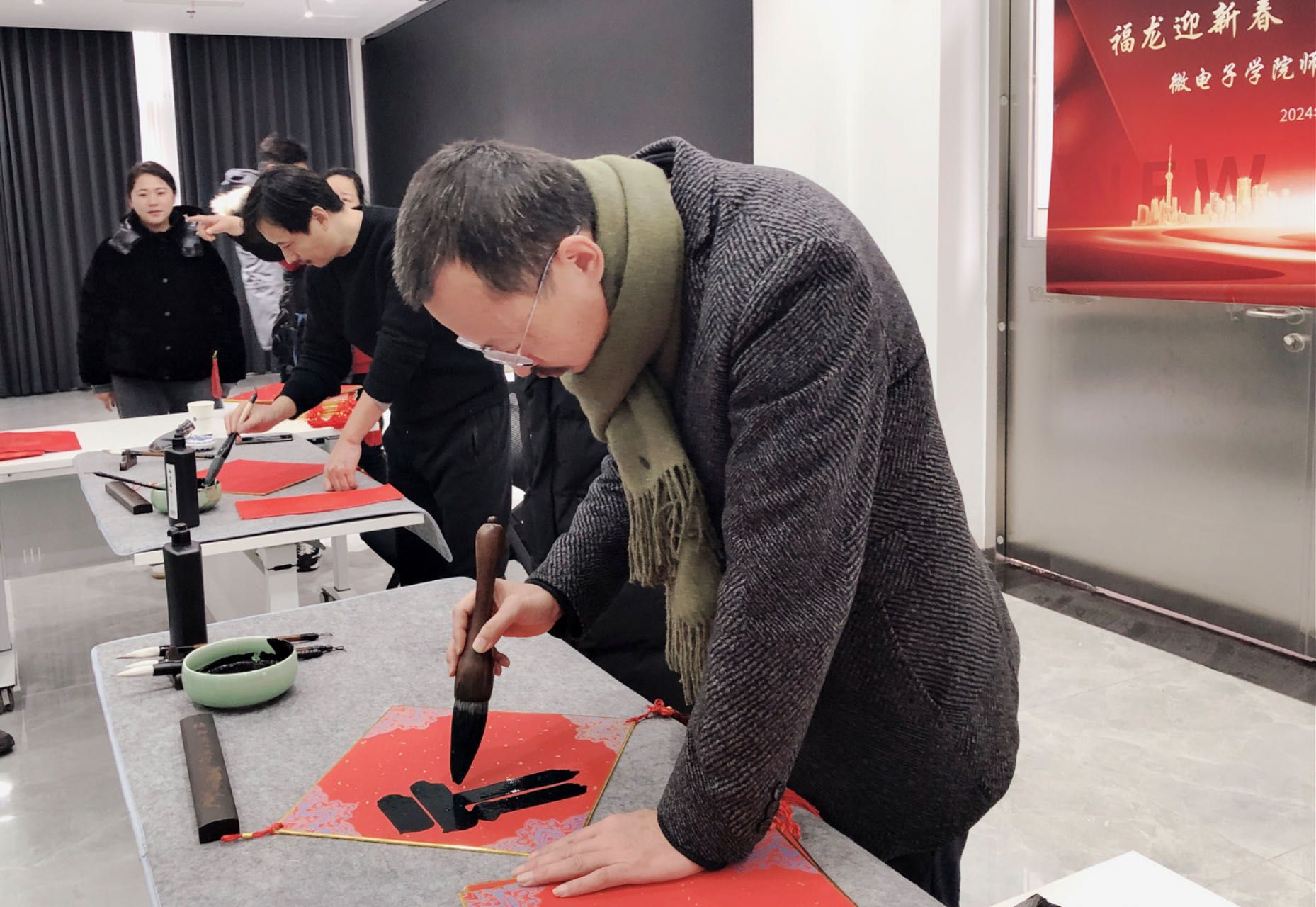 为弘扬中华优秀传统文化,丰富微电子学院师生文化生活,学院工会、青联会于2月1日在学院A楼大厅开展“福龙迎新春,笔墨中国‘芯’”师生写春联送祝福活动。活动邀请了中国美术家协会会员、中国壁画学会会员、上海美术家协会会员、上海大学上海电影学院讲师王味之,上海大学书画协会会长、上海大学上海美术学院教师、书法家钱楷,与学院师生一道挥毫创作出自己心仪的春联、福字。学院党委副书记、副院长、分工会主席袁铭,副院长路秀真以及学院师生、嘉定校区相关老师等参加了活动。