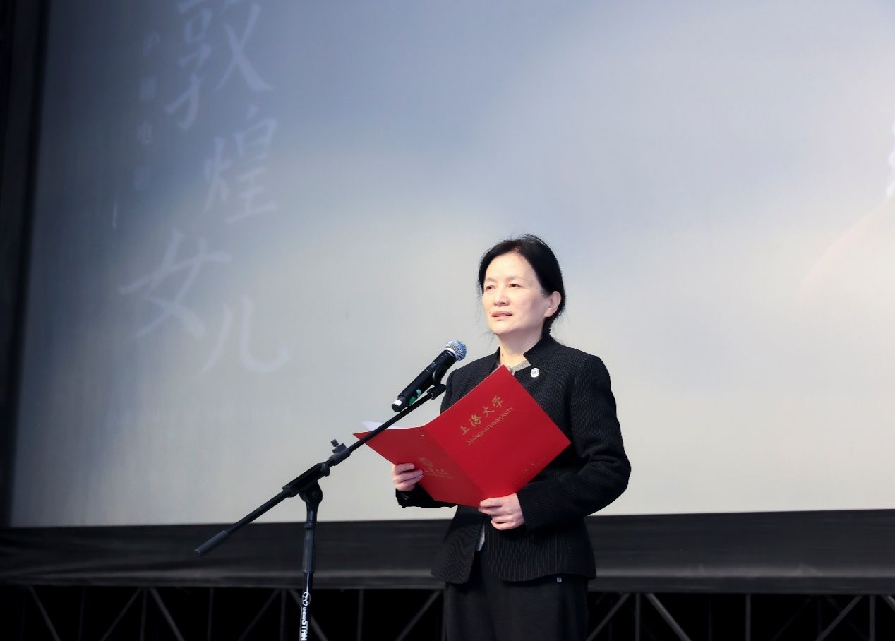 校党委常委、副校长聂清致辞。她赞赏了《敦煌女儿》电影创作团队的杰出贡献,希望大家通过观赏电影《敦煌女儿》深入感悟传统文化之美,并学习樊锦诗先生“择一事、终一生”的奋斗精神,感受信仰与坚守的力量;她强调文化传承与创新的重要性,激励全校师生以创新精神承担文化传承的责任,积极实现个人梦想并为民族复兴做出贡献;最后她向滕俊杰导演,茅善玉老师表示感谢,希望上海沪剧院以及优秀电影制作团队能够把更多的艺术精品送入大学校园,与青年对话、与未来对话,并祝愿沪剧实景电影《敦煌女儿》上海大学放映会取得圆满成功!