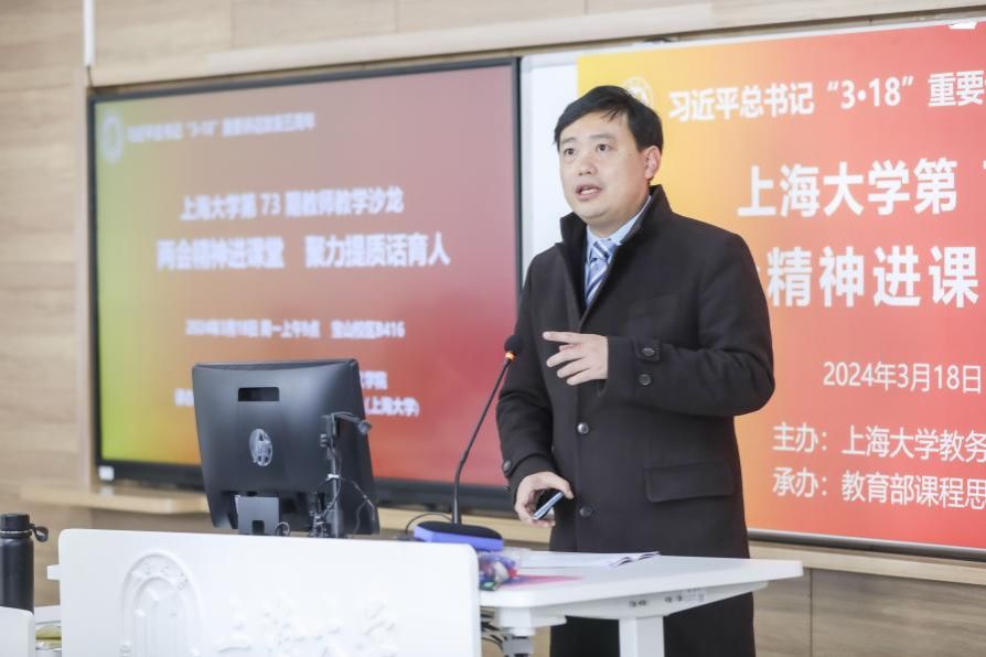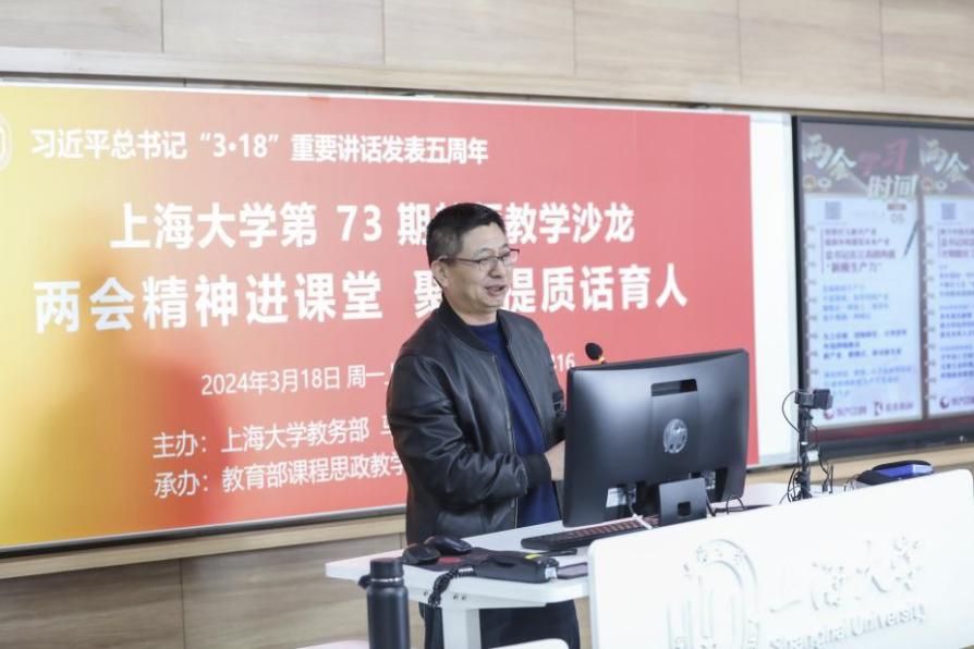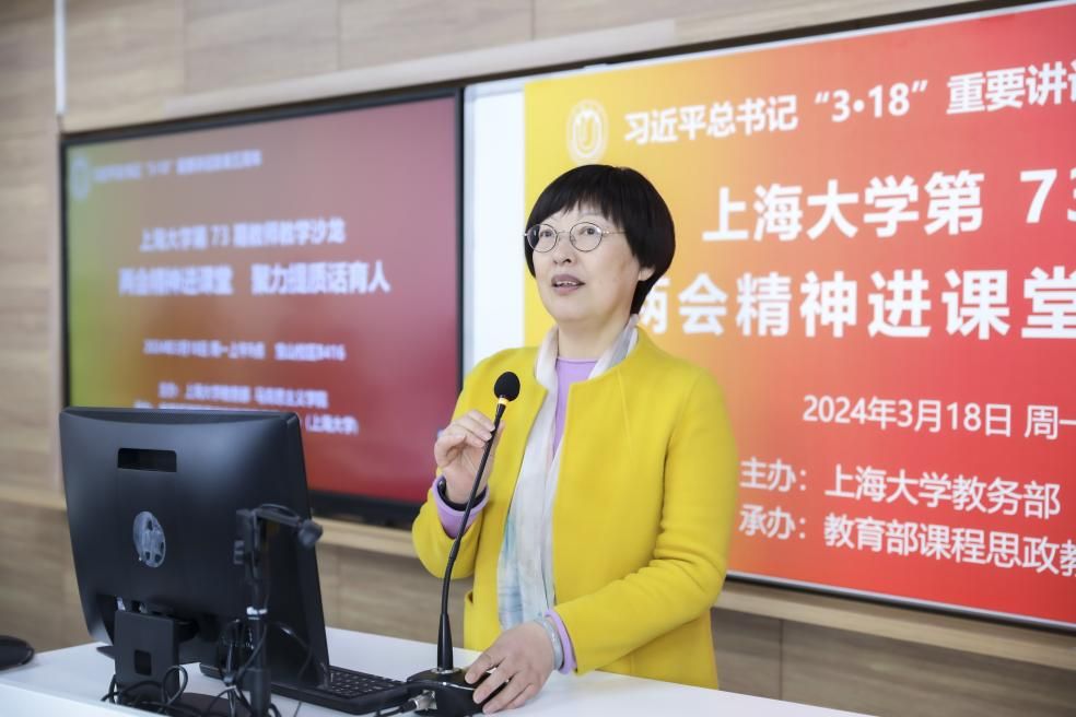 为重温2019年3月18日习近平总书记在学校思想政治理论课教师座谈会上发表的重要讲话精神,及时有机融入党的二十大精神和两会内容,聚力提升思政课和各类课程教学质量,2024年3月18日,上海大学在宝山校区B416举办专题教学沙龙。本次沙龙由上海大学教务部、马克思主义学院主办,教育部课程思政教学研究示范中心(上海大学)承办。来自马克思主义学院、理学院、材料科学与工程学院、计算机工程与科学学院、生命科学学院等40多名一流课程、课程思政示范课程教师参会。沙龙由教务部副部长、教育部课程思政教学研究示范中心(上海大学)负责人顾晓英教授担任主持。上海大学党委副书记、副校长胡大伟出席。
