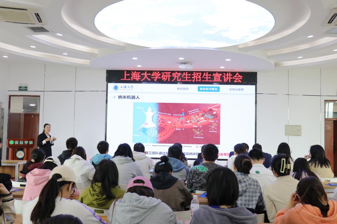 首先,东北农业大学食品学院副院长李良对高海燕一行的来访表示了热烈的欢迎,并希望以此促进双方之间学术科研交流合作。向慧静教授向参与的广大同学做题为“纳米医药与疾病治疗”的学术报告,详细讲述了纳米医学与纳米医药的发展历程,并介绍了最新的纳米医学科技动态和思路。