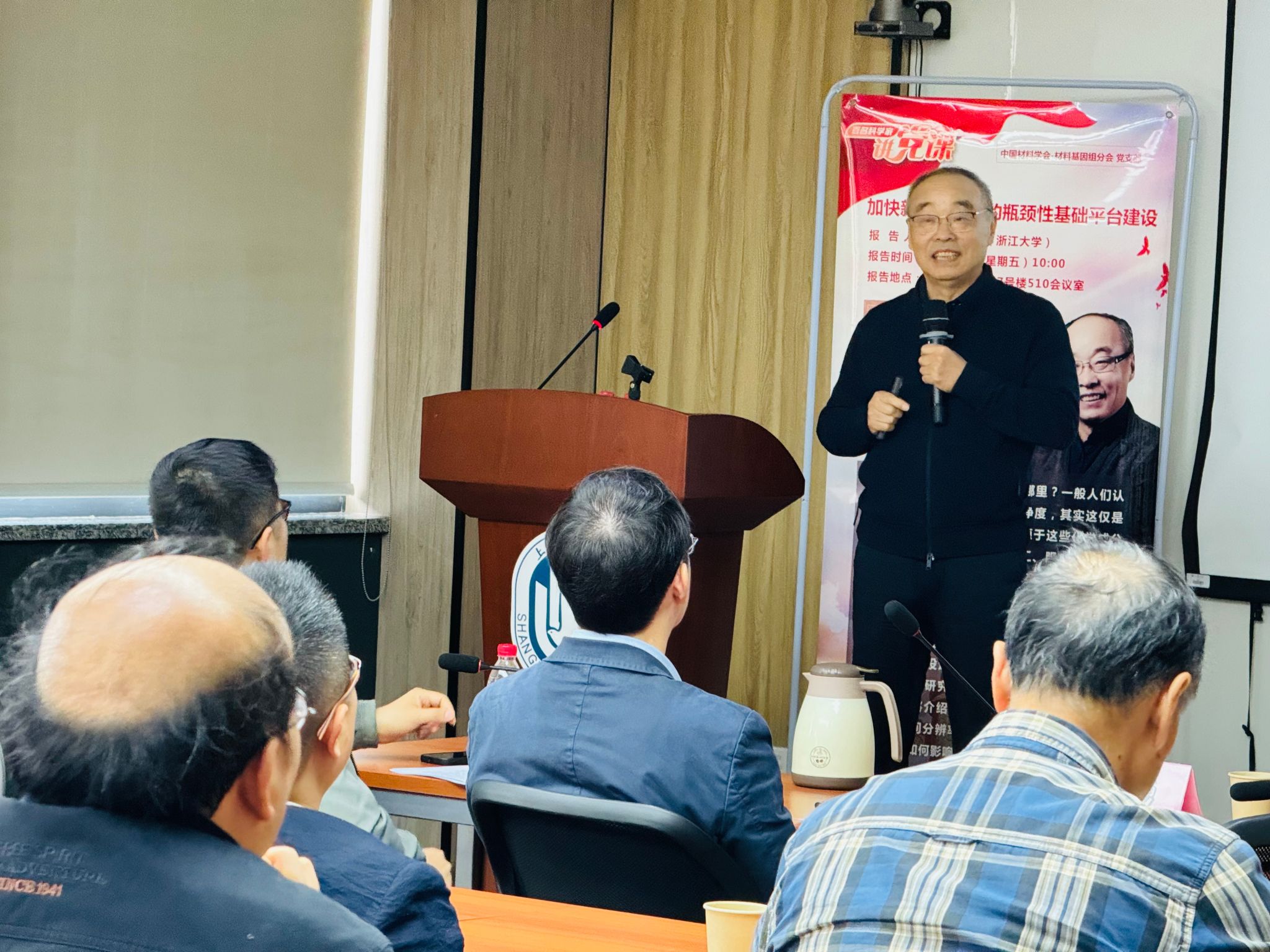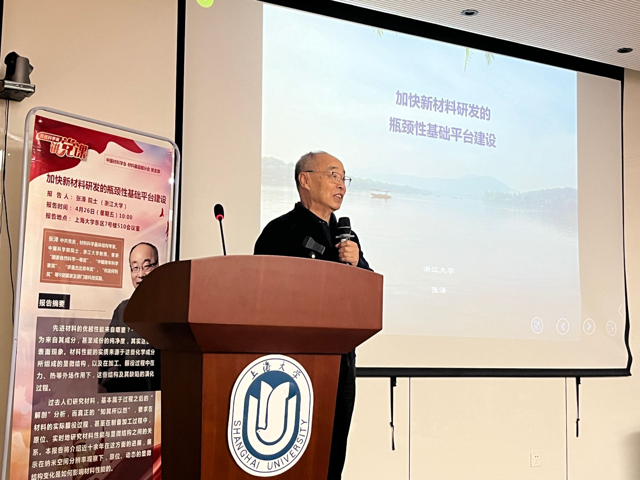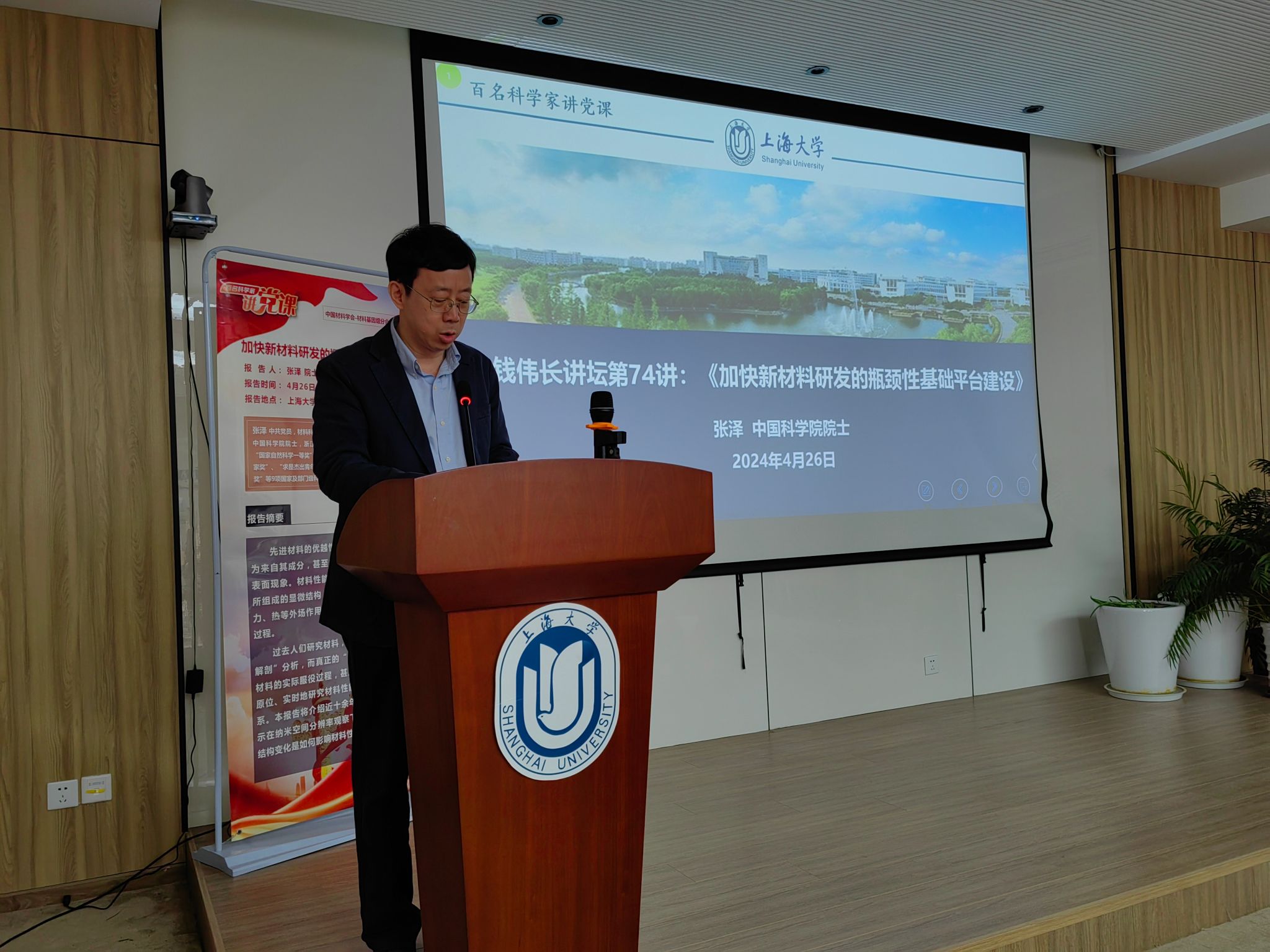 4月26日上午,钱伟长讲坛第74讲暨中国材料学会材料基因组分会“百名科学家讲党课”活动开讲仪式、第一讲《加快新材料研发的瓶颈性基础平台建设》在上海大学宝山校区东区七号楼510会议室顺利举行。中国科学院院士,浙江大学材料科学与工程学院张泽教授应邀作主题报告。报告由校党委副书记、纪委书记段勇教授主持。报告吸引了来自钱伟长学院、材料基因组工程研究院、材料学院、理学院、微电子学院等单位的师生参与。