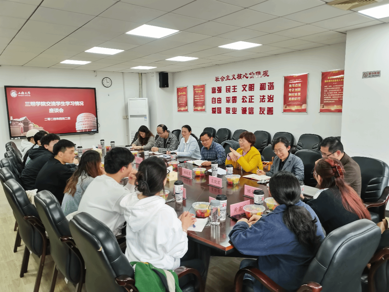 老师们一一介绍了自己授课班里三明学院交流生的学习表现,希望同学们能进一步加强与上大学生的交流,增强学习紧迫感。顾晓英部长感谢老师们对三明学生的关注和关心,指出上海大学学习节奏较快,期末考试将至,请任课老师务必和学生强调考试要求,督促学生提前做好复习迎考准备。她还建议两校专业学院进一步做好交流学生的课程对接,教务部也将持续做好学生学业跟踪,期待三明学院同学能更加积极主动,以主人翁精神为上大教育教学建设与管理献计献策。三明学院曾玲老师和任士钊老师表达了对授课老师们的由衷感谢。