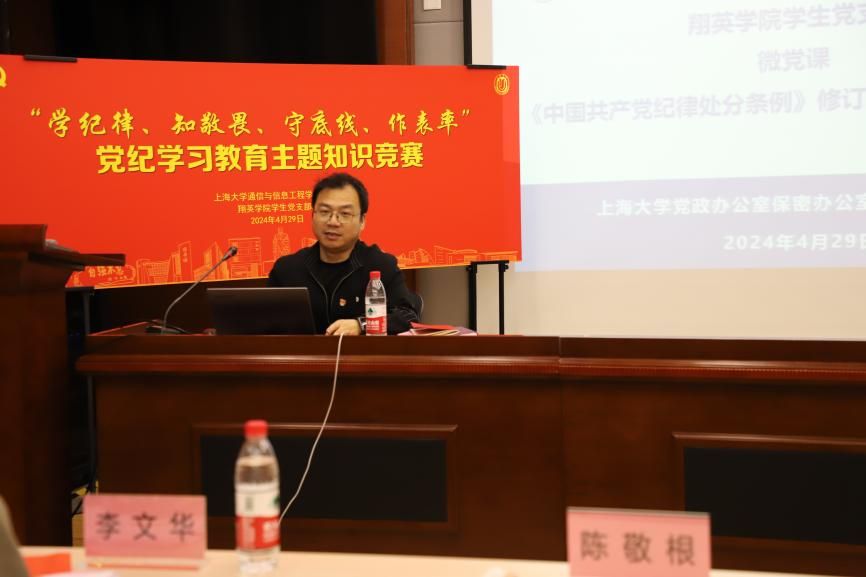 为贯彻落实党中央、市委和市教卫工作党委关于开展党纪学习教育的部署,按照校院党委总体安排,4月29日,翔英学院学生党支部组织全体本科生党员开展“学纪律、知敬畏、守底线、作表率”党纪学习教育主题知识竞赛。来自支部党员、入党积极分子组成共6支队伍现场同台竞技,通过个人抢答、组内抽答、团队攻擂等多个特色环节,以生动、多元形式深入学习党规党纪。上海大学党政办公室副主任、法律事务办公室主任陈敬根老师、上海大学通信学院党委副书记、副院长陈涛老师、翔英学院学生党支部书记李文华老师、翔英学院辅导员严思远老师等出席参与本次活动,与在场学子共学党规党纪。