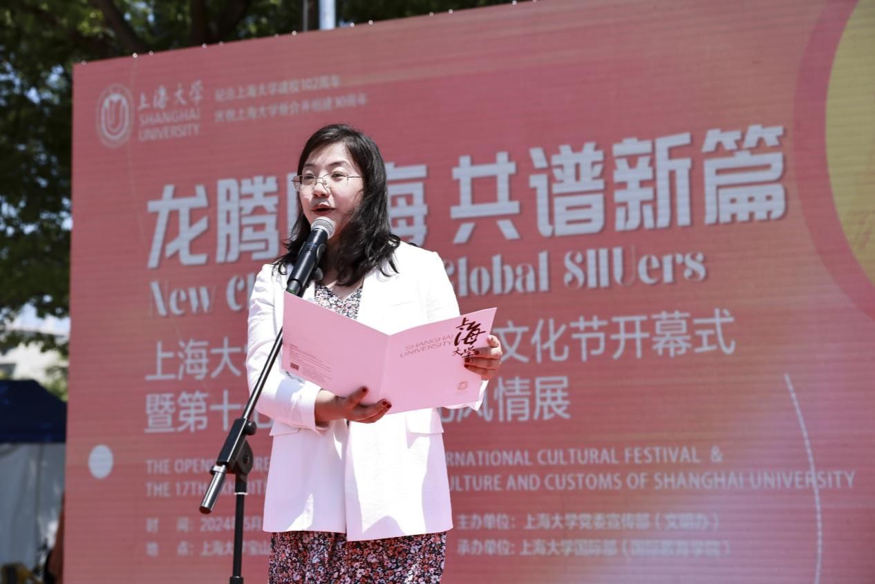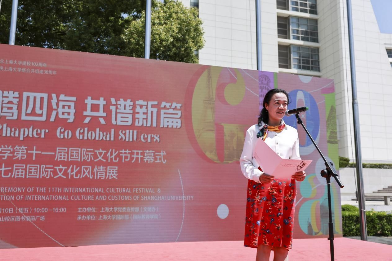 上海大学国际部党委书记王丽娜发布国际文化节信息。