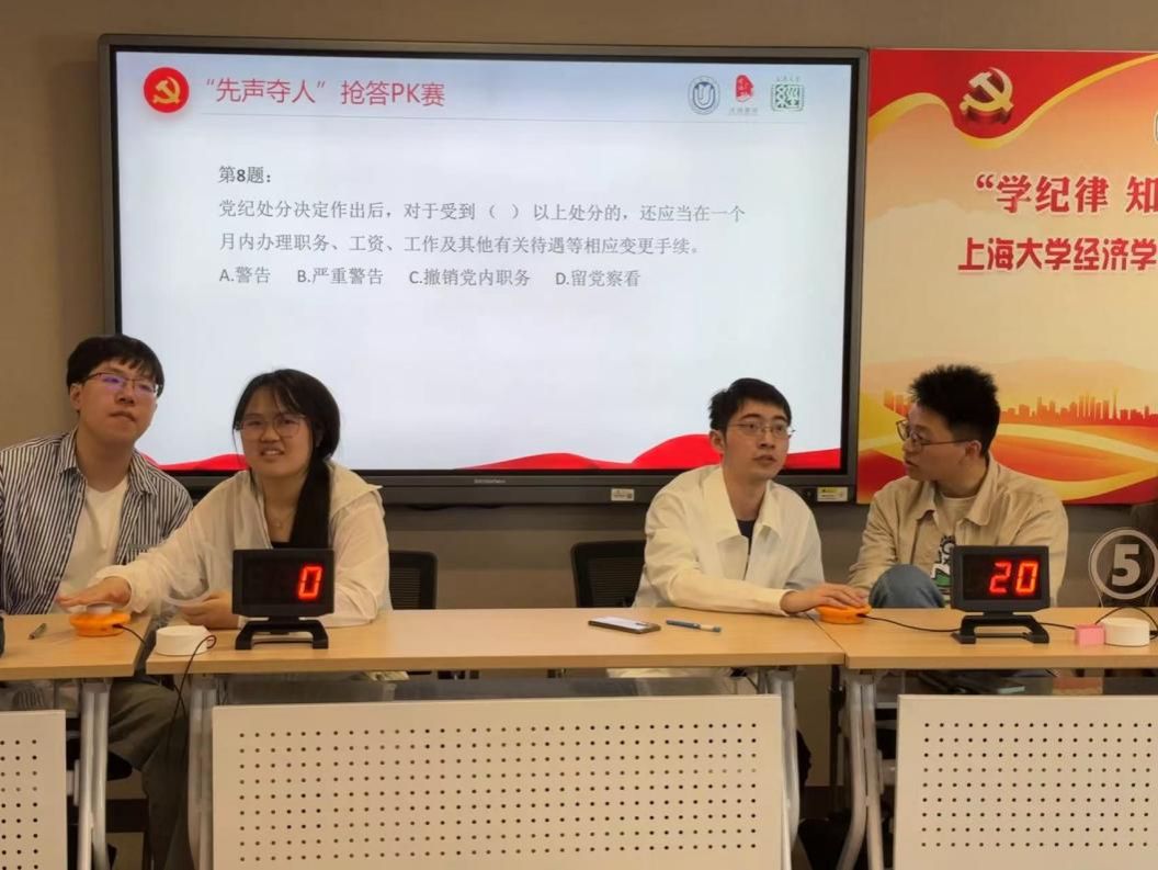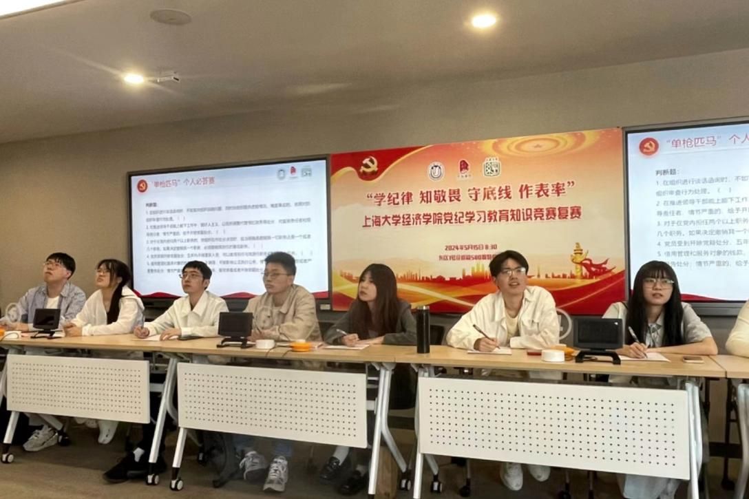 为贯彻落实党中央、市委和市教卫工作党委关于开展党纪学习教育的部署,根据校、院党委总体安排,5月15日上午,经济学院组织各研究生支部与本科生支部共同开展“学纪律、知敬畏、守底线、作表率”党纪学习教育主题知识竞赛复赛。学生工作办公室思政科副科长孙钟玲、经济学院党委副书记、副院长冯玉鑫、经济学院党委组织员范春艳、学院团委书记黄婉璐、研究生党建中心主任夏唯伟、学院本科生第一党支部书记孙冰、本科生第二党支部书记秦丽君及各支部代表等共同参与本次活动。本次党纪学习教育主题知识竞赛复赛分为9组,每组3人,通过多个环节的比拼,加强学生党员对党规党纪的学习,深化对《中国共产党纪律处分条例》的理解与掌握,内化于心,外化于行。