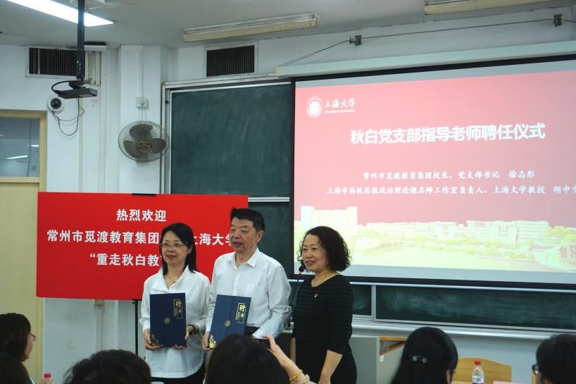 为了更好发挥党建引领作用,指导支部建设,社会学院党委副书记、副院长张乃琴向常州市觅渡教育集团校长、党支部书记徐志彤和上海市高校思想政治理论课名师工作室负责人、上海大学教授胡申生颁发“秋白党支部指导老师”聘书,希望未来能够创新基层支部发展,引领广大师生党员传承瞿秋白精神。
