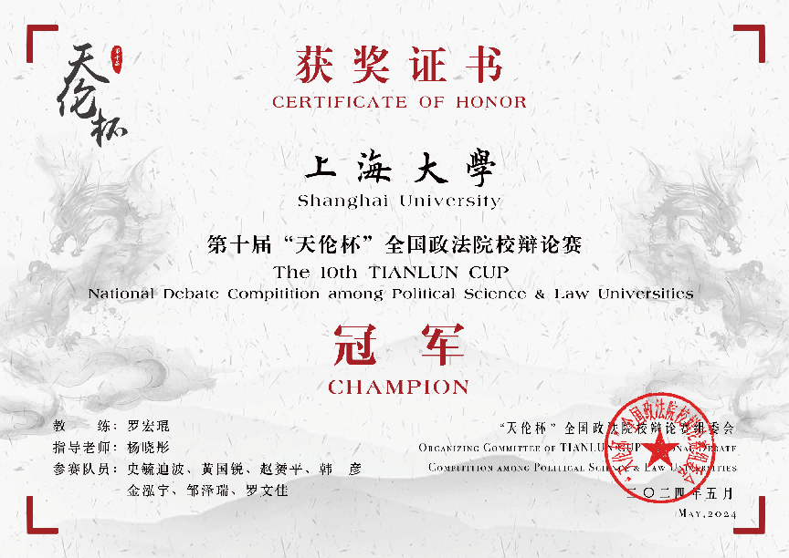 5月19日下午,第十届“天伦杯”全国政法院校辩论赛在西南政法大学落幕。上海大学辩论队荣获大赛冠军,我校辩手史毓迪波获总决赛获决赛优秀辩手,同时摘得“全程最佳辩手”称号。