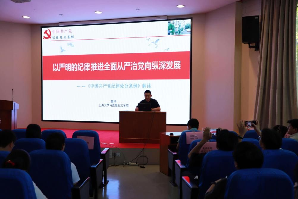 计票期间,上海大学马克思主义学院教师管坤以《以严明的纪律推进全面从严治党向纵深发展》为主题,深度解读了《中国共产党纪律处分条例》,教育各位党员要时刻以党规党纪校正思想和行动。