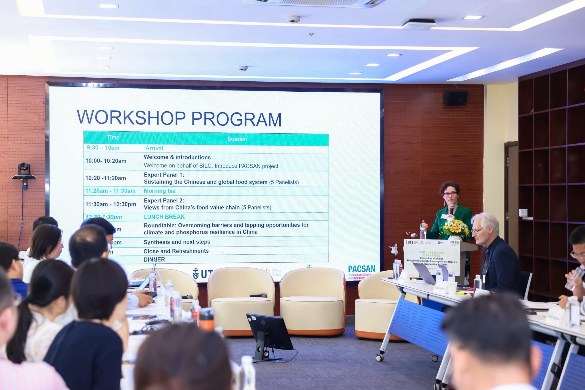Stuart White教授和Dana Cordell副教授详细介绍了PACSAN项目,该项目由澳大利亚外交贸易部提案的澳中基金会资助,旨在汇集中澳两国的食品系统研究人员和利益相关者,共享知识并制定应对气候变化和磷稀缺对食品供应挑战的策略。Dana Cordell副教授讨论了农业和食品价值链在全球温室气体排放中所占比重之大,以及磷肥使用所面临的有限原材料、高风险和成本上升等问题,强调转型食品系统的必要性及其对食品安全和水质改善的积极影响。