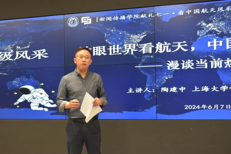 6月7日下午,上海大学新闻传播学院“献礼七一·学习航天精神”特别讲座在智能媒体传播创新实验中心104室顺利举行。本次讲座特邀“上海大学快乐百岁讲师团”陶建中教授作为主讲嘉宾,与新闻传播学院全体师生进行了互动和交流。本次讲座由新闻传播学院副院长牛盼强主持。