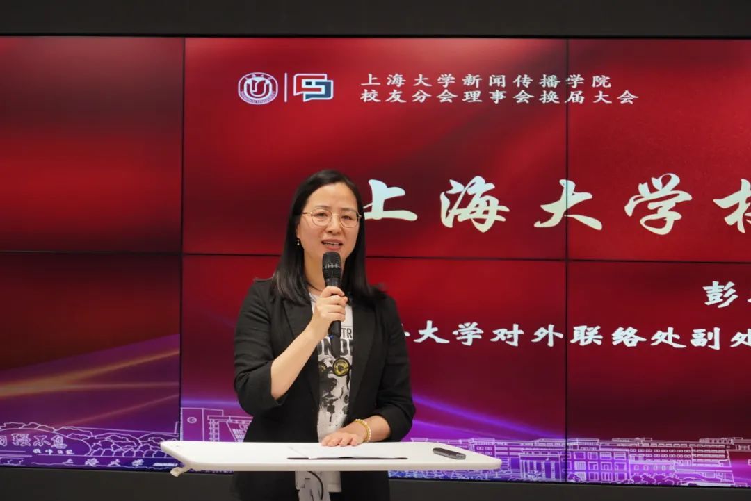 上海大学对外联络处副处长、校友会办公室副主任彭明霞代表学校对各位新传校友表示欢迎,也对各位校友一贯支持学校育人工作表示感谢,同时也对新闻传播学院校友分会理事会换届大会的召开表示祝贺。她表示,学校校友办积极支持新闻传播学院校友工作,对校友分会理事会换届筹备工作给予相关指导。在校友分会新一届理事会成立之际,希望各位校友用心传承上大精神,齐心建设一流大学,在各项工作中取得更大成就。