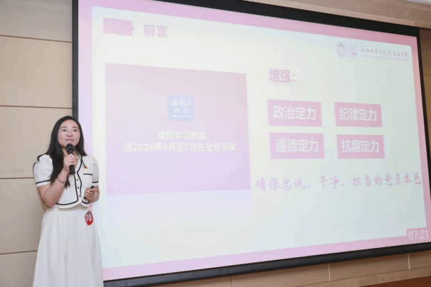 上海大学党委副书记、副校长胡大伟作总结讲话。他对同学们的用心准备和精彩展示表示肯定,并强调了党纪学习教育的重要性。他指出,研究生党员要以高标准严格要求自己,做到知行合一,始终保持奋发有为的精神状态。他强调,“小课堂讲好大纪律”,通过“小课堂”这种形式,将党纪内化于心,外化于行,真正做到学以致用。
