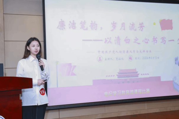 本次比赛以“学纪知纪作表率,明纪守纪树新风”为主题,各学院遴选推荐29门课程参加校级初赛,18门课程脱颖而出进入决赛。决赛中,各参赛研究生党员以党纪学习教育为主题,有的结合党章、党史,用青年研究生的视角解读新修订后的《中国共产党纪律处分条例》;有的讲述正面先锋故事进行激励鼓舞,引用反面典型进行警示警醒;有的结合科研工作、校风学风生动呈现师生党员知纪律己、担当奋进的精神风貌。
