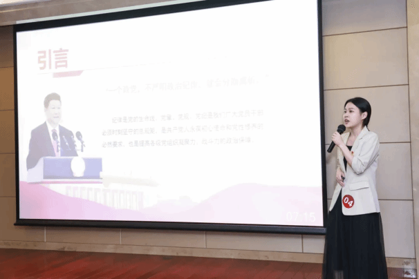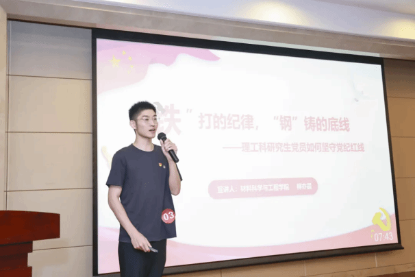 “科研领域不是党规党纪的真空地带,我们应注重科研诚信与党纪党规的统一,杜绝学术不端行为,确保科研真实性和公正性,树立优良学风。”材料科学与工程学院研究生党员柳亦晨以《“铁”打的纪律,“刚”筑的底线》为题,以“铁”和“钢”形象比喻研究生们在工作和生活中所需遵循的严格纪律和坚定底线。未来技术学院研究生党员黄宇腾通过“汉芯一号”芯片伪造、论文学术造假等科研领域的实际案例,强调“任何一个微小的信息泄露,都可能对国家的安全和利益造成不可估量的损失。”