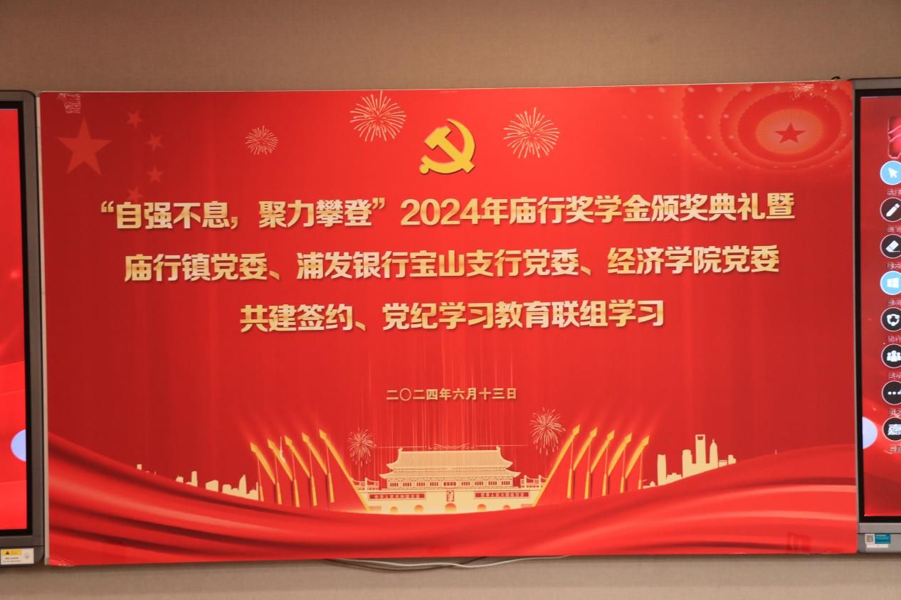 6月13日上午,“自强不息 聚力攀登”2024年庙行奖学金颁奖典礼暨庙行镇党委、浦发银行宝山支行党委、经济学院党委共建签约、党纪学习教育联组学习在上海大学宝山校区经管楼580举行。庙行镇党委、浦发银行宝山支行党委、上海大学经济学院党委班子成员代表出席,“庙行奖学金”获奖学生代表参加了本次活动。