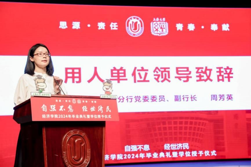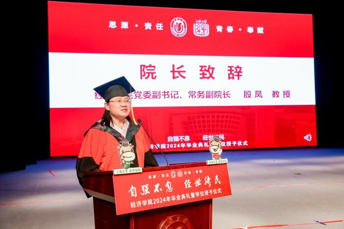 随后,上海大学经济学院党委副书记、常务副院长殷凤致辞,对全体毕业生表示热烈的祝贺,并勉励毕业生们在未来的道路上不仅在个人层面实现自我超越,也为社会的进步贡献自己的力量。她强调,无论是学术、职业还是个人生活领域,持之以恒都是通往成功的必要条件,毕业生们要以今天的成就为新起点,携手共创一个更加美好的未来。