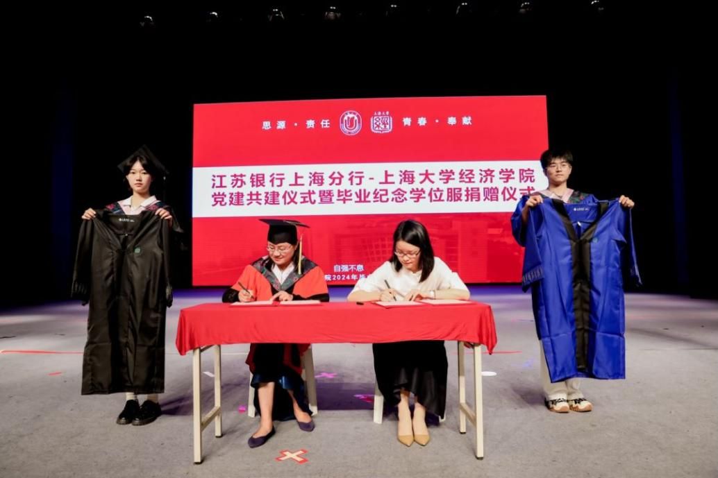接着,江苏银行上海分行与上海大学经济学院举行了党建共建仪式暨毕业纪念学位服捐赠仪式,标志着校企合作的新篇章。仪式开始,江苏银行上海分行党委委员、副行长周芳英女士,上海大学经济学院党委副书记、常务副院长殷凤老师共同上台,签署了“江苏银行上海分行-上海大学经济学院党建共建协议”。
