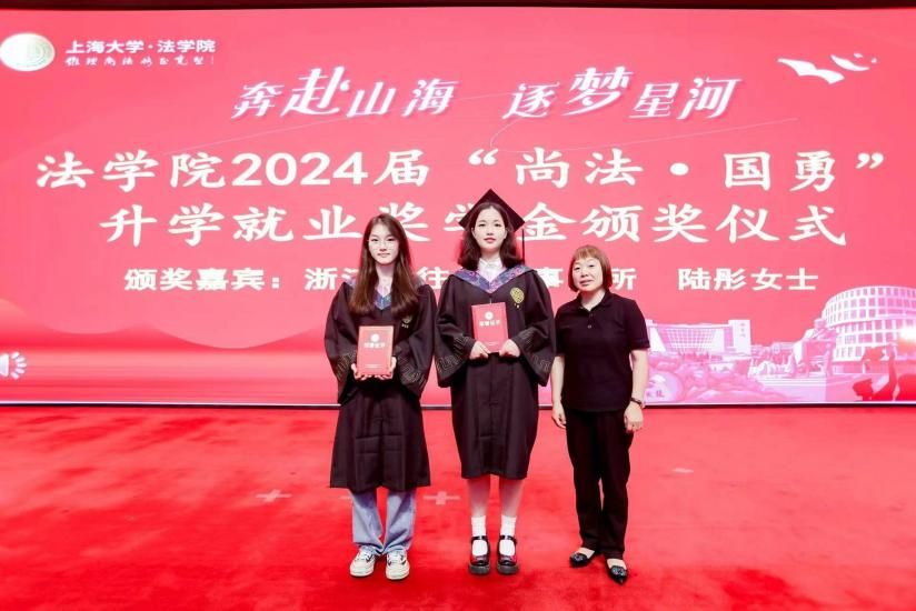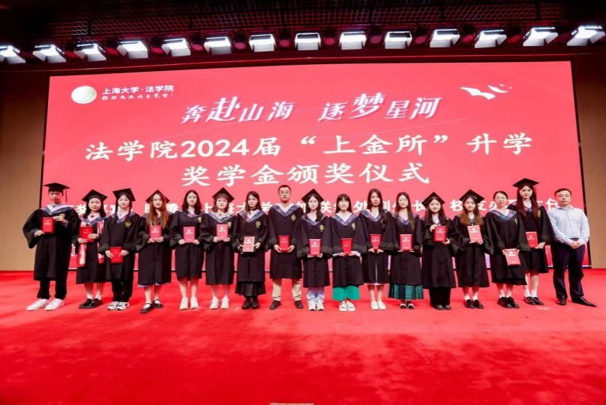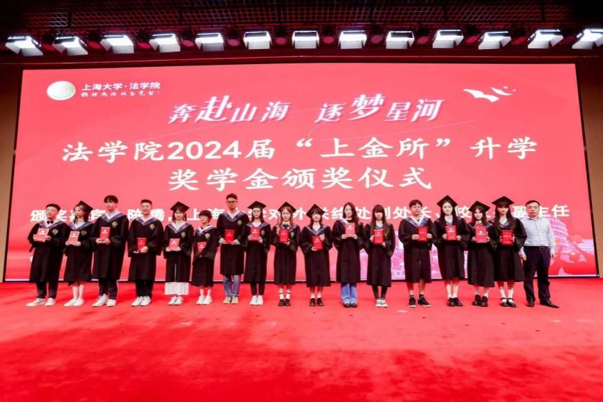 在2024 年“上金所”升学奖学金颁奖仪式上,上海大学对外联络处副处长、校友办副主任陈腾,法学院文学国教授共同为获得“上金所升学奖学金”的同学颁奖,预祝大家继续攀登法学高峰。