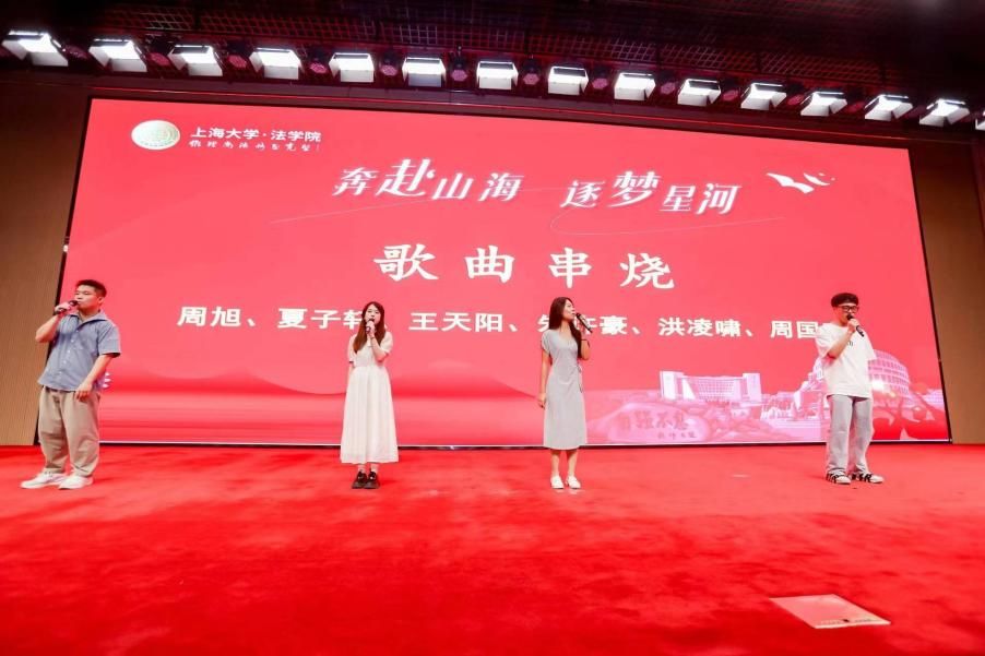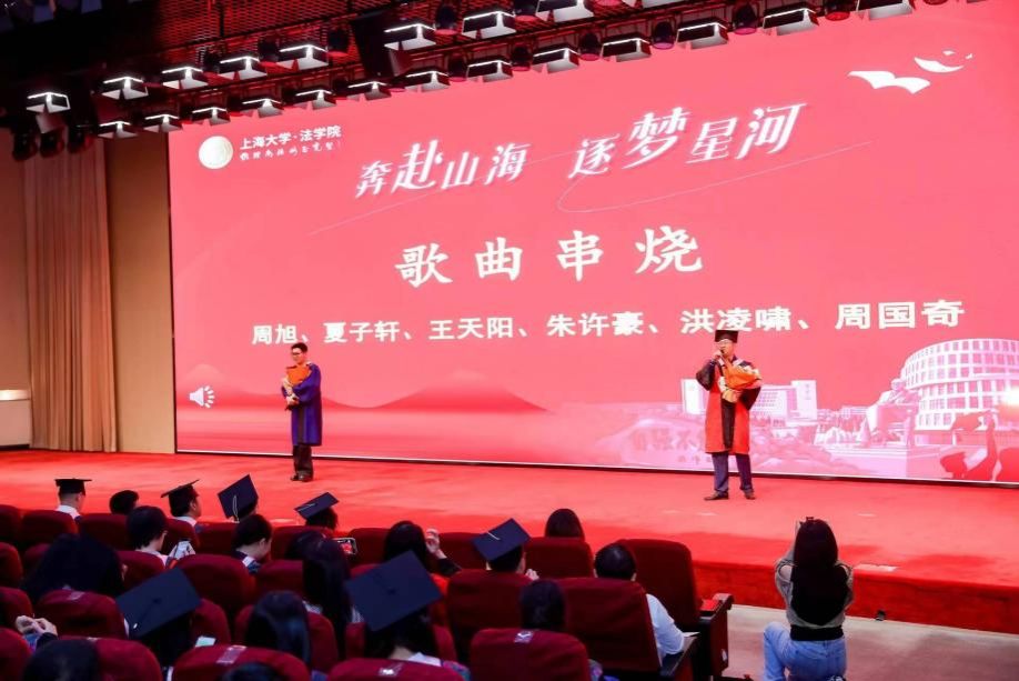 承载师生满满回忆的2024年毕业生暖场视频、上海大学法学院名誉院长蔡冠深博士寄语视频后,由周旭、夏子轩、王天阳、朱许豪、洪凌啸、周国奇带来的歌曲串烧点燃了全场的氛围。随后,毕业典礼在雄壮的国歌声中拉开帷幕。