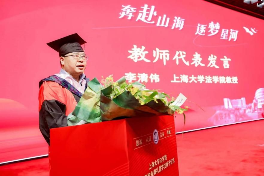 莘莘学子意、浓浓师生情。上海大学法学院教授李清伟老师作为教师代表发言。李教授殷切祝愿同学们未来怀揣法治之梦,扬法律理性之帆,启法律职业成功之路,并给予了毕业生们三点寄语。首先,以法律为业,要保持理性、恪守正义。法律的运行并不是简单的技术主义作业,许多案件的裁判需要以正义为尺度,兼用理性与智慧作出。其次,以法律为业,要坚守法律的德性底线、尊重法治规律。不论从事何种职业,都要坚守法律的底线、恪守法治原则,不屈从于任何权威,秉持法律的德性,法治的愿景终将“行则将至”。最后,以法律为业,要心存感激,行稳致远。法律向来不是冷冰冰的“械具”,法律是为人服务的,要懂得体悟法律之爱。李清伟教授嘱托同学们要懂得感恩,即使离别也不忘常回家看看,并衷心祝愿所有毕业生鹏程万里,前程似锦。
