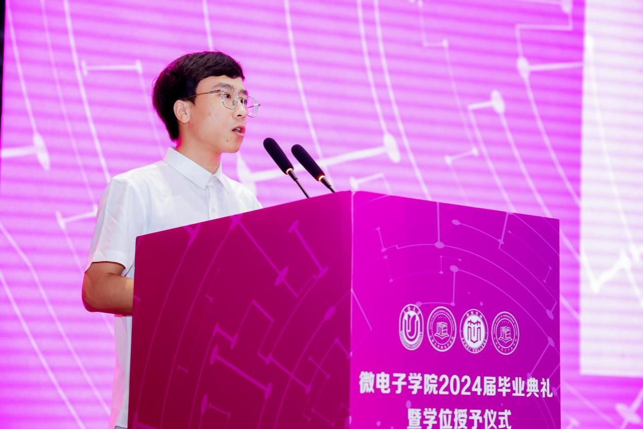 学院第一届本科毕业生校友代表、核芯智存科技有限公司测试工程师李渊明发言,激励同学们潜心工作,为集成电路事业发展贡献青春力量。