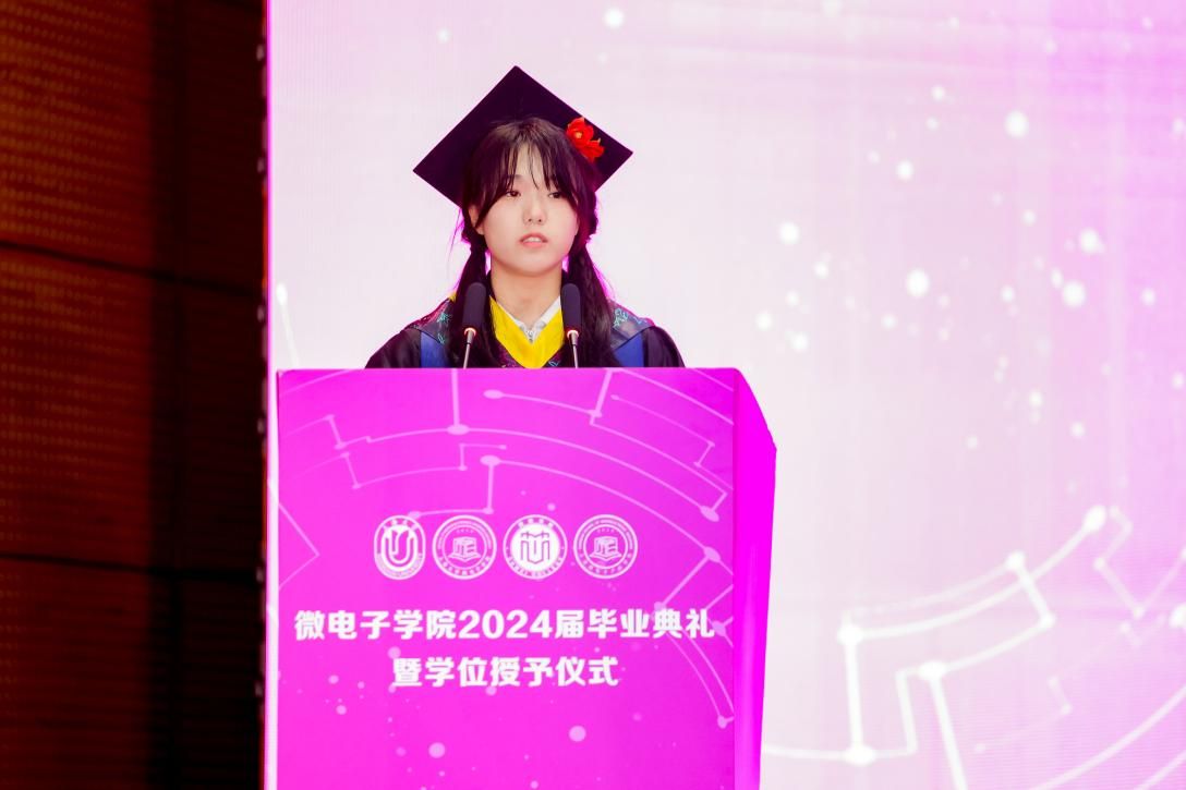 校长奖学金获得者、市优秀毕业生、微电子科学与工程专业本科生孙佳晨,市优秀毕业生微电子学与固体电子学专业研究生代表张文魁回顾了在校园内的无数难忘回忆,感谢学院和微电子全体教师们的培养和关怀,同时表达了心怀国之大者的报国之志和为集成电路事业发展而奋斗的决心。