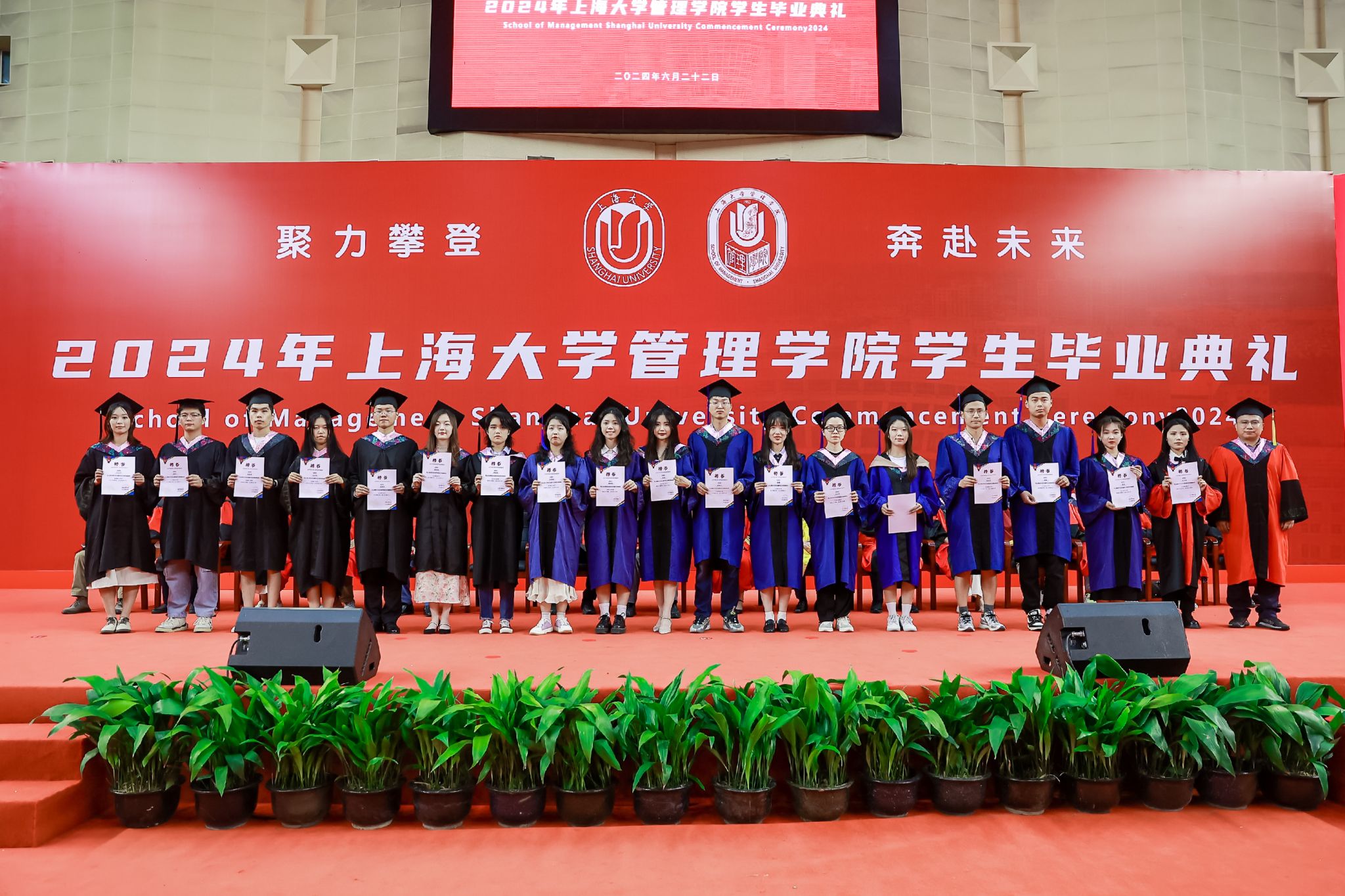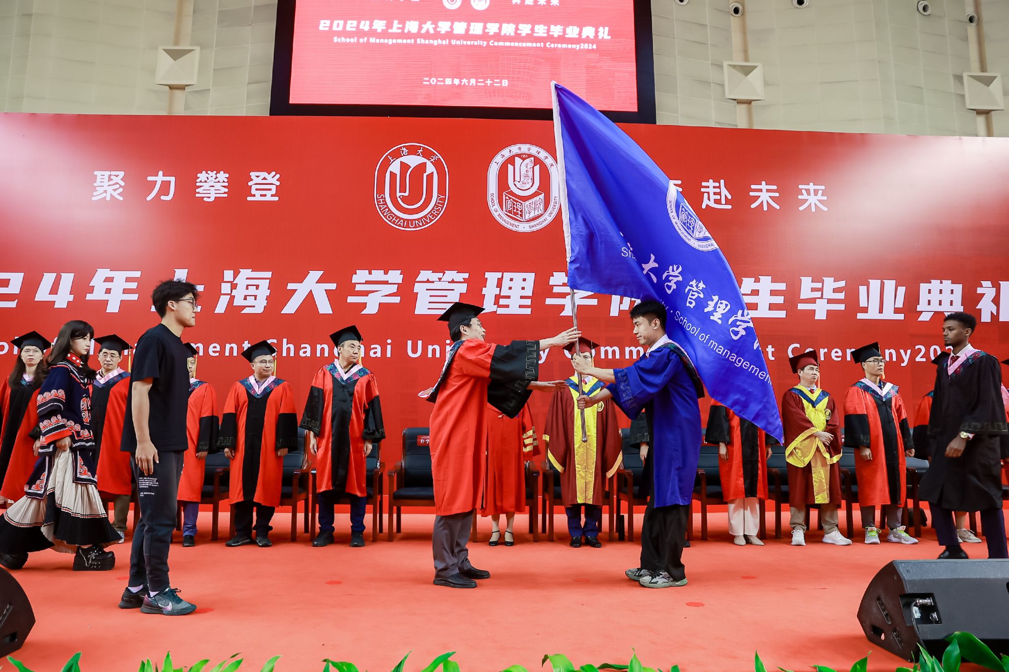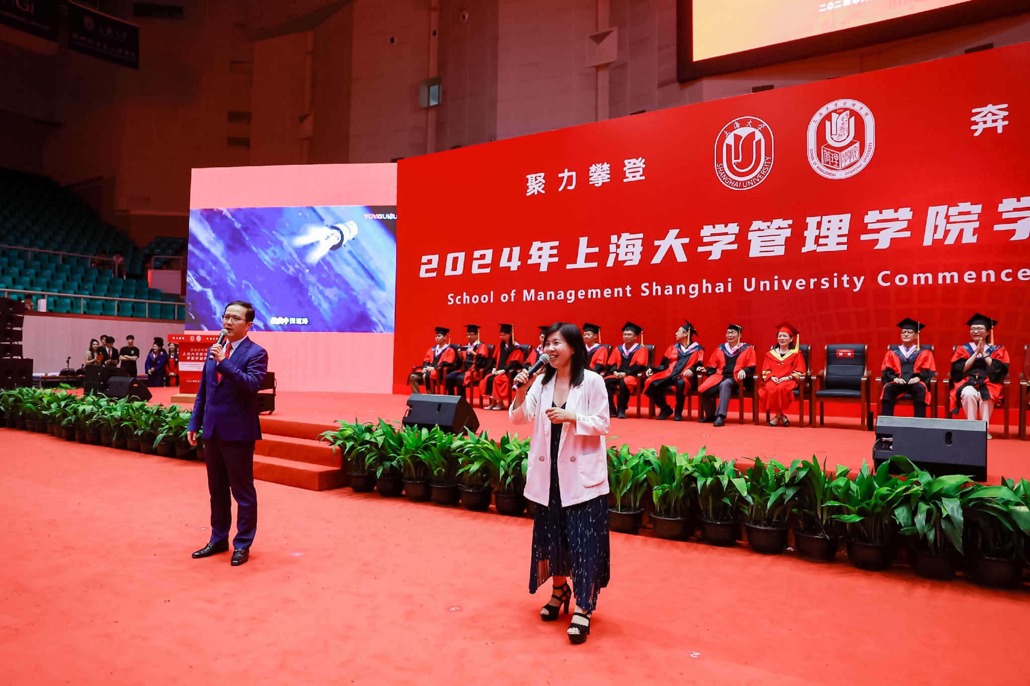 6月22日下午,上海大学管理学院2024年毕业典礼暨学位授予仪式于宝山校区体育馆隆重举行,1000多名师生和家长共同庆祝管理学院2024届本科生、硕士生、博士生顺利完成学业。上海大学党委常委、副校长聂清,管理学院党委书记许学国,管理学院党委副书记、院长镇璐,体育学院党委副书记、副院长卢高峰,管理学院党委副书记、副院长马亮,副院长于晓宇、许科以及学位委员会成员、各系领导、导师、毕业班辅导员和管理学院2024届毕业生及家长出席本次活动。典礼由2022级工商管理本科生韩宇和2021级管理科学与工程硕士毕业生彭可欣主持。