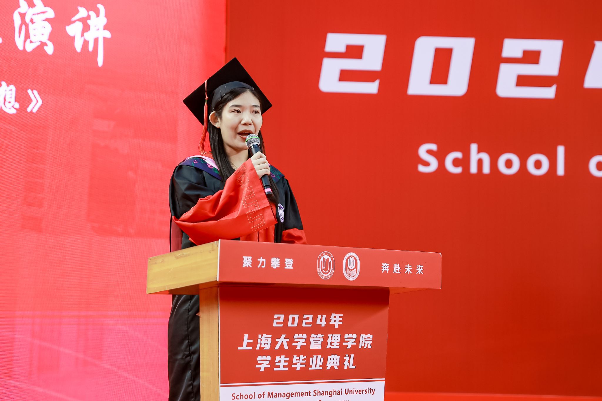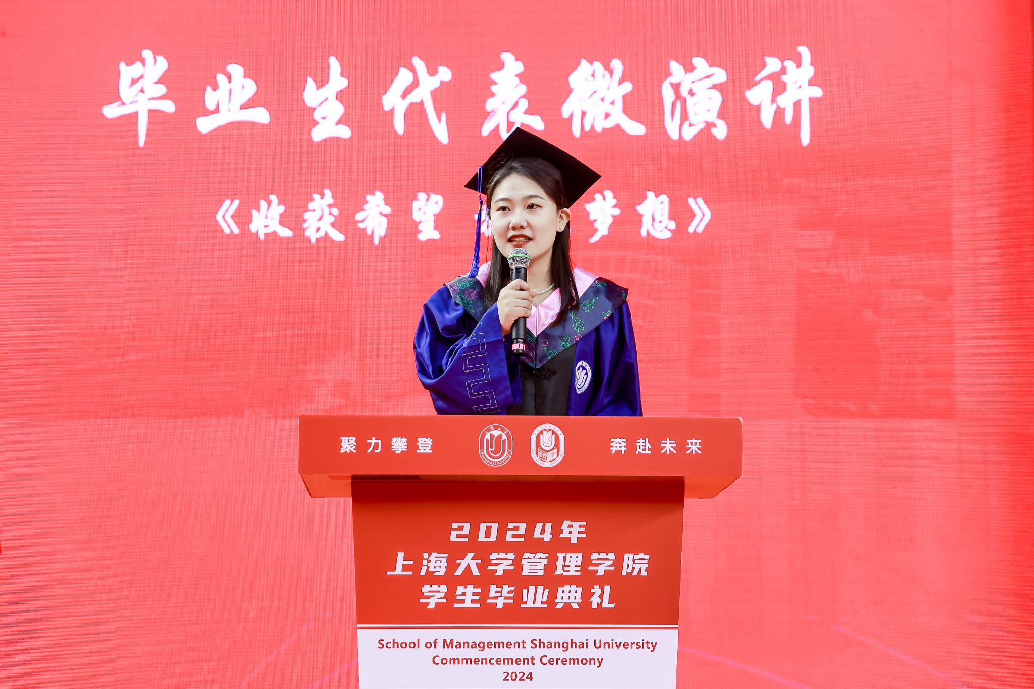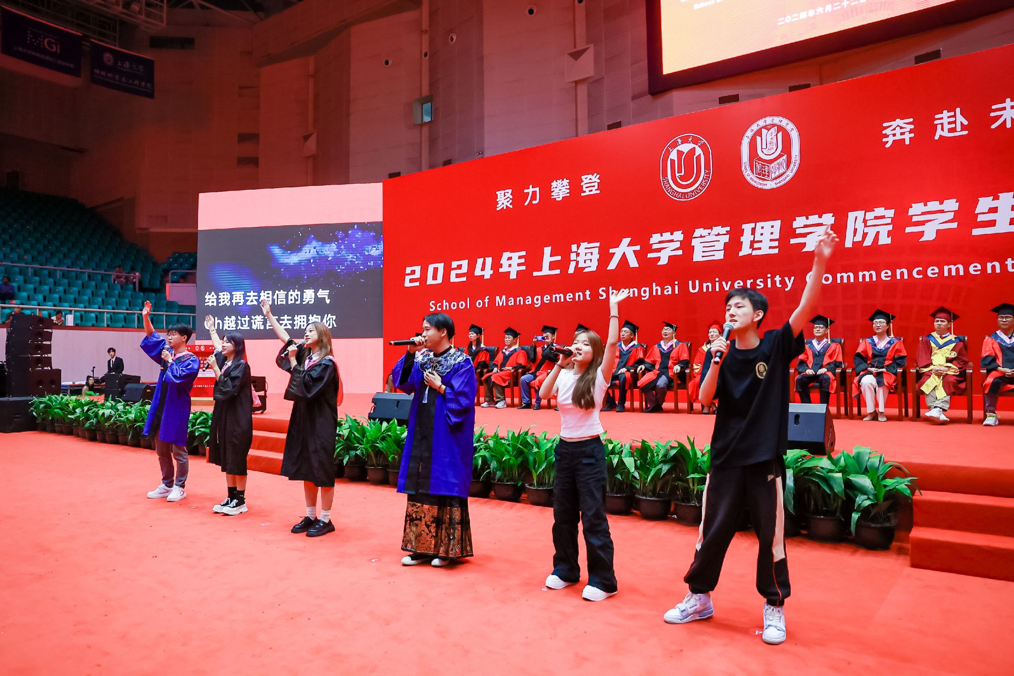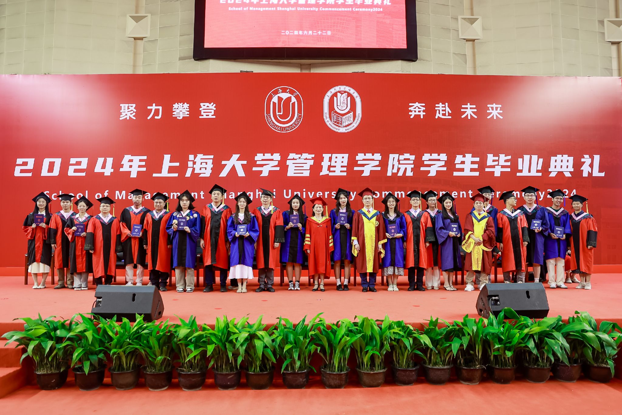 6月22日下午,上海大学管理学院2024年毕业典礼暨学位授予仪式于宝山校区体育馆隆重举行,1000多名师生和家长共同庆祝管理学院2024届本科生、硕士生、博士生顺利完成学业。上海大学党委常委、副校长聂清,管理学院党委书记许学国,管理学院党委副书记、院长镇璐,体育学院党委副书记、副院长卢高峰,管理学院党委副书记、副院长马亮,副院长于晓宇、许科以及学位委员会成员、各系领导、导师、毕业班辅导员和管理学院2024届毕业生及家长出席本次活动。典礼由2022级工商管理本科生韩宇和2021级管理科学与工程硕士毕业生彭可欣主持。