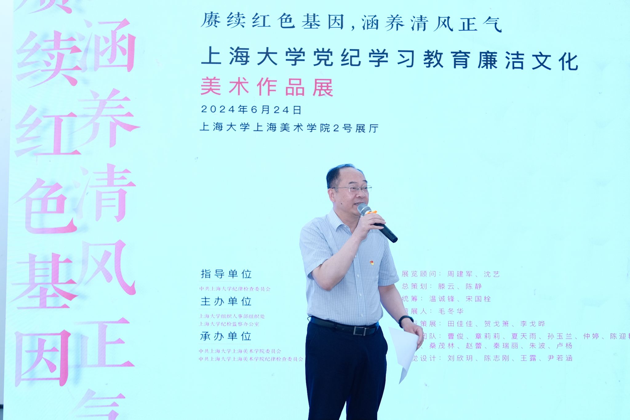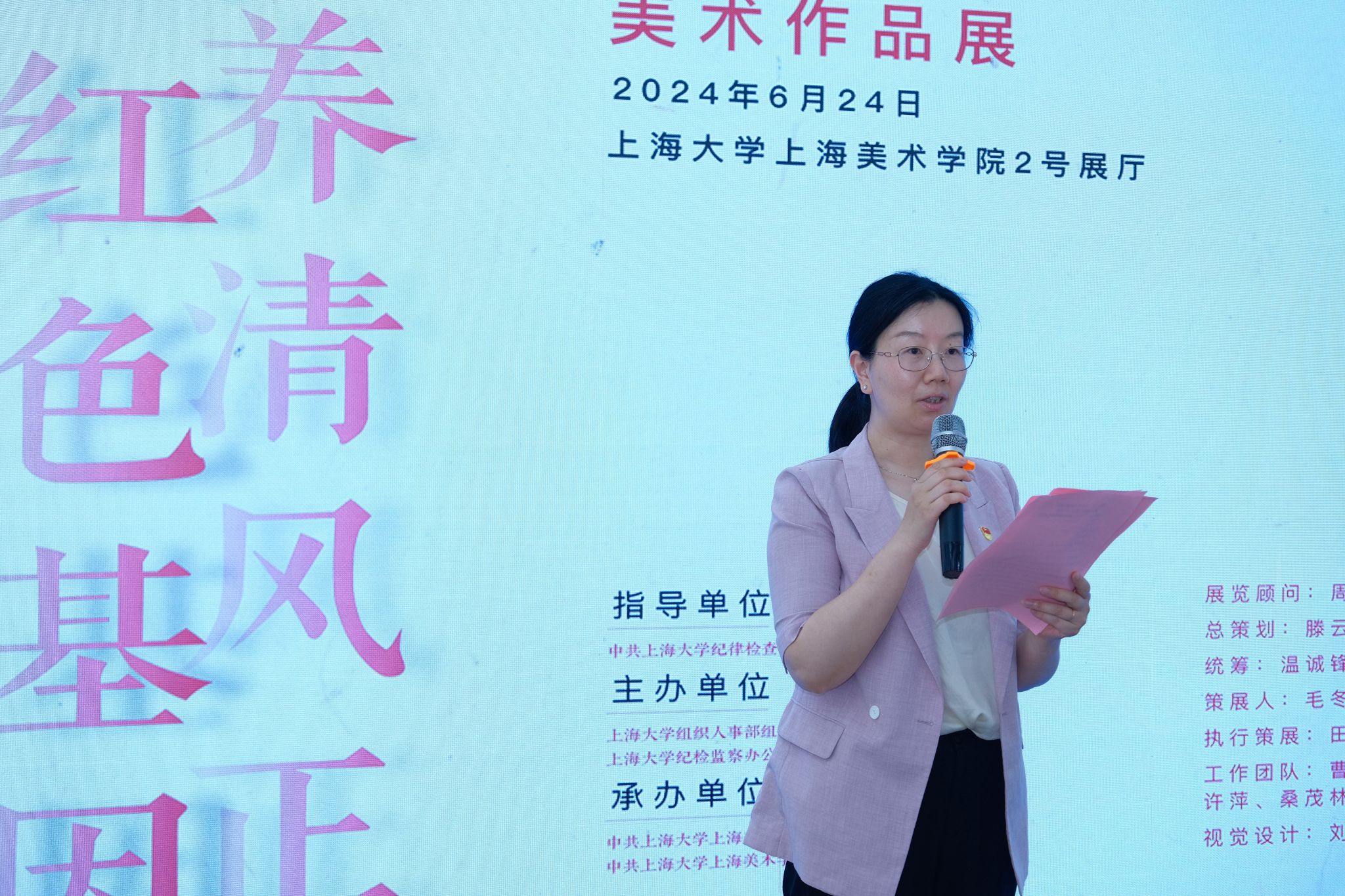 上海美术学院党委书记陈静在开幕式中致辞。当前全党正在开展党纪学习教育,美术学院深刻领会习近平总书记关于加强纪律建设是全面从严治党的治本之策的重要论述,准确把握加强纪律建设的重大意义,联系实际开展了形式多样的学习教育。本次展览作品主题鲜明、内涵丰富、风格多样、立意深远,不仅仅是艺术佳作,更是上海大学党纪学习教育的生动教材,是美术学院一堂深入开展党纪学习教育、筑牢初心使命的廉政党课。
