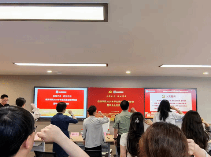 会议在全体与会人员齐唱国歌声中拉开帷幕。随后,大家一起通过视频短片回顾了经济学院这一学年来学生党建工作开展情况。在2023-2024 学年,经济学院学生党建工作在学工办和研工部的关心指导下,结合新形势下的党建工作要求,围绕服务同学们的全面发展,努力夯实组织基础、严守发展党员质量、提升组织生活品质、打造特色品牌项目。
