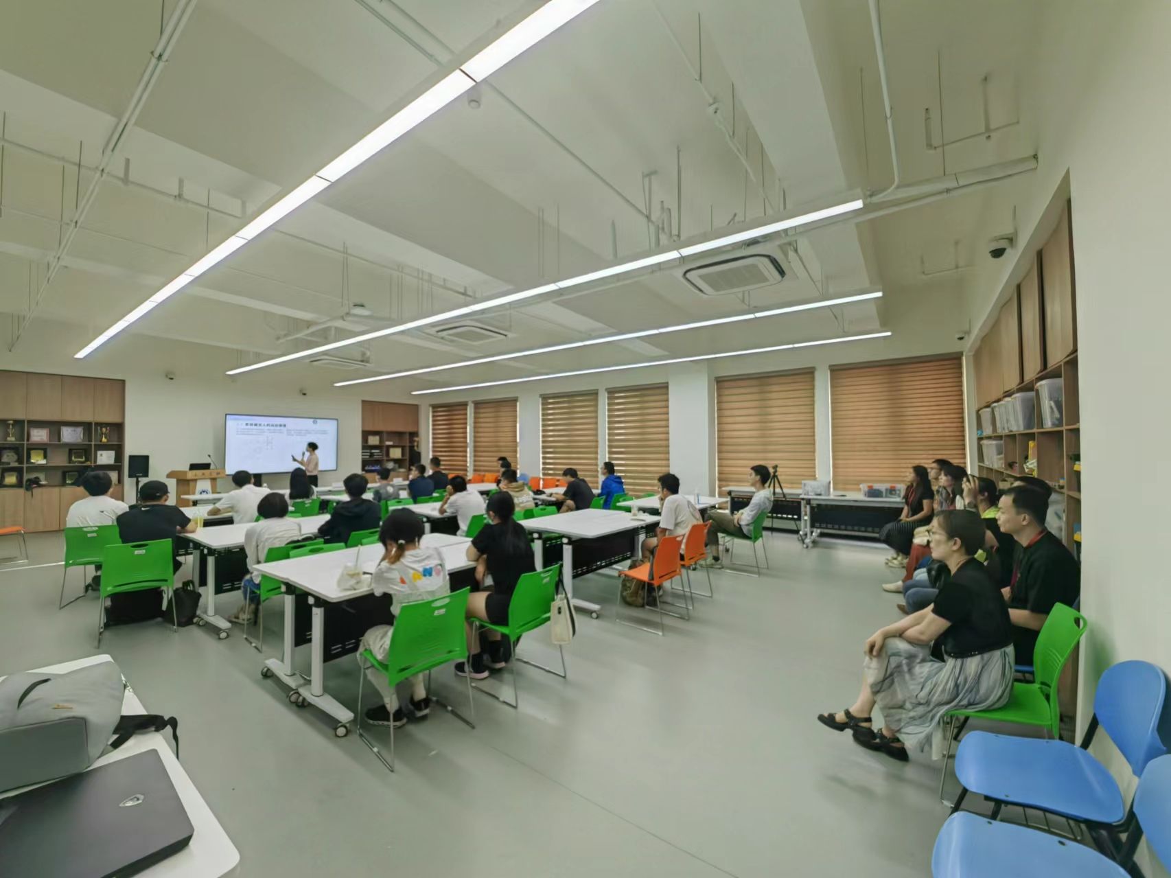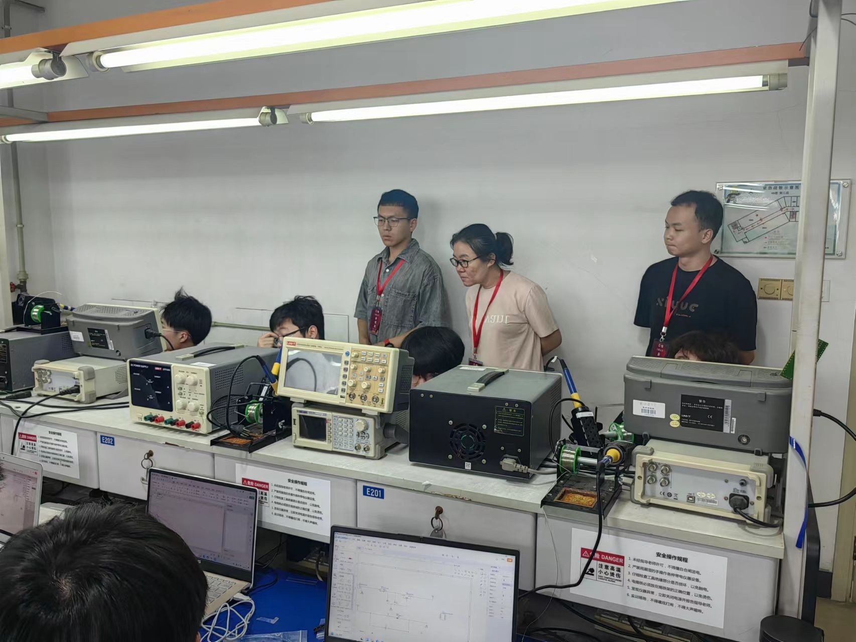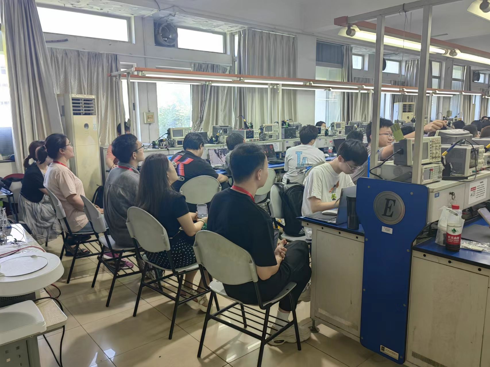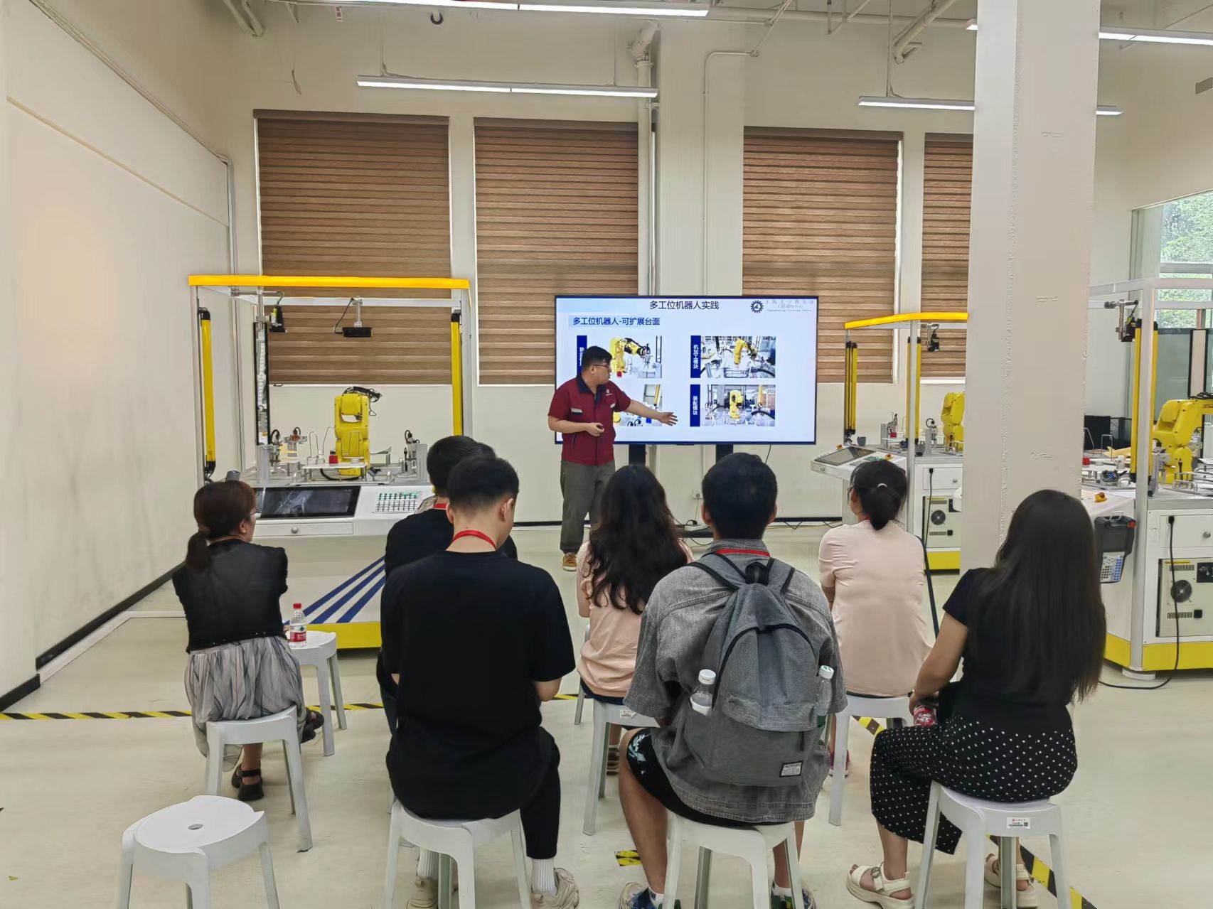 呼市二中教师代表团依次旁听了上海市重点课程《电子实习》与上海市一流课程《金工实习》两门课。《电子实习》作为上海大学夏季学期的大批量学生重要实训环节,以智能物流小车作为课程项目载体,充分践行赛课结合理念,通过分组实验、项目制作等形式,让学生在动手操作中深化理解,掌握实际应用的知识和技能,激发创新思维。在《金工实习》的课堂上,众多精心设计的教学模块如操作学习先进加工制造和测量设备、沉浸式演示智能制造线、操作体验多工位机器人等,都使得老师们对自动化加工、智能分拣与高效储存等环节有了更为直观的认识,全方位感受了现代制造业的精髓。