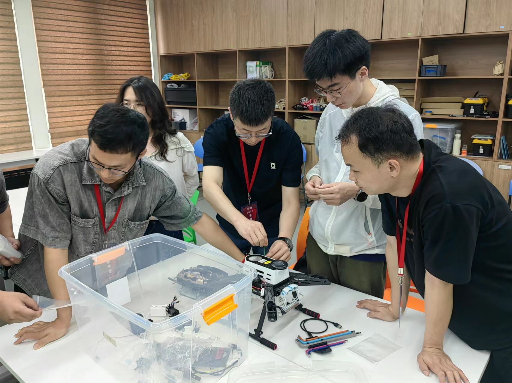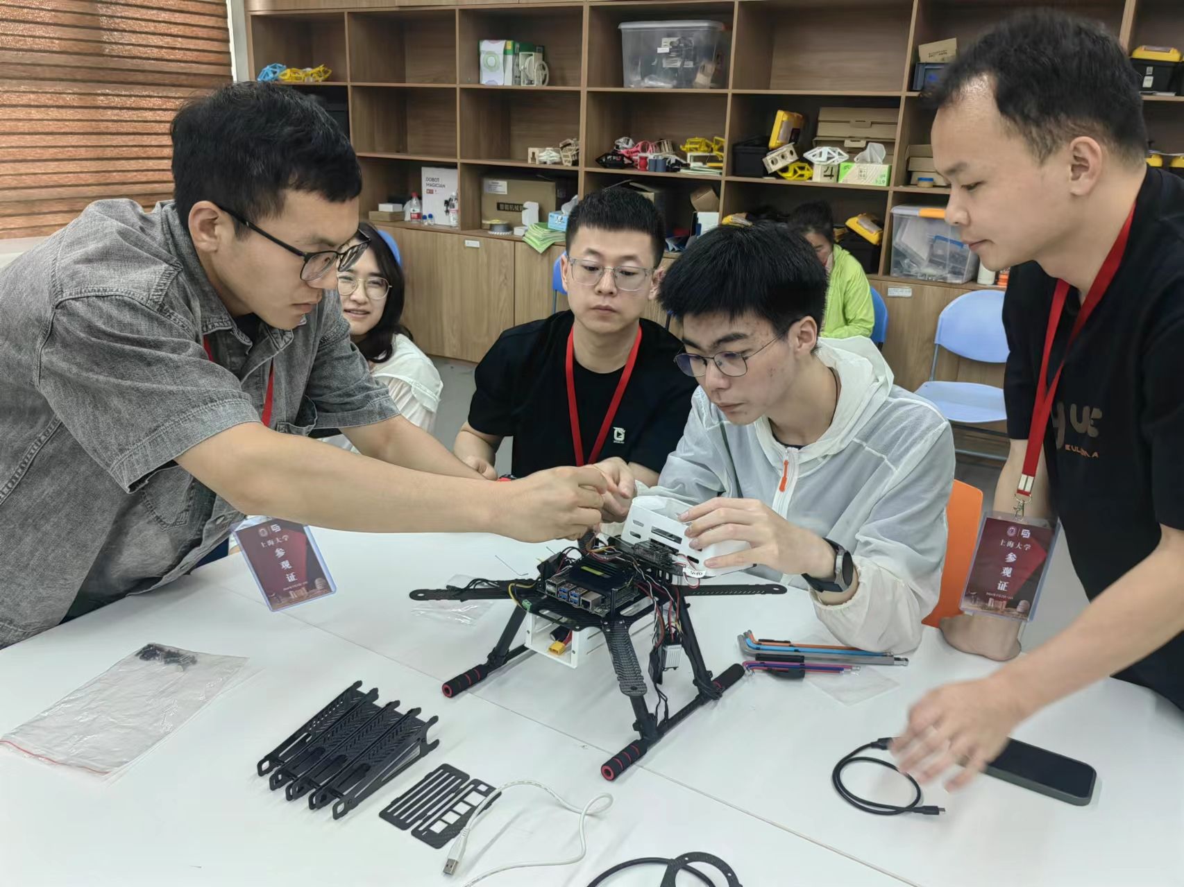 此外,教师代表团还观摩学习了由上海大学招生就业处主办、教务部工训中心承办的“基于无人机的工程创新实践”高中生夏令营活动的实践课程。“人工智能”+“教育”的教学新模式,为广大学生提供了高质量的锻炼机会和展示平台,通过此次参观交流,教师代表团们也纷纷表示受益匪浅,不仅进一步丰富了教学视野,也为之后在教学方法和课程设计上提供了新的启示。