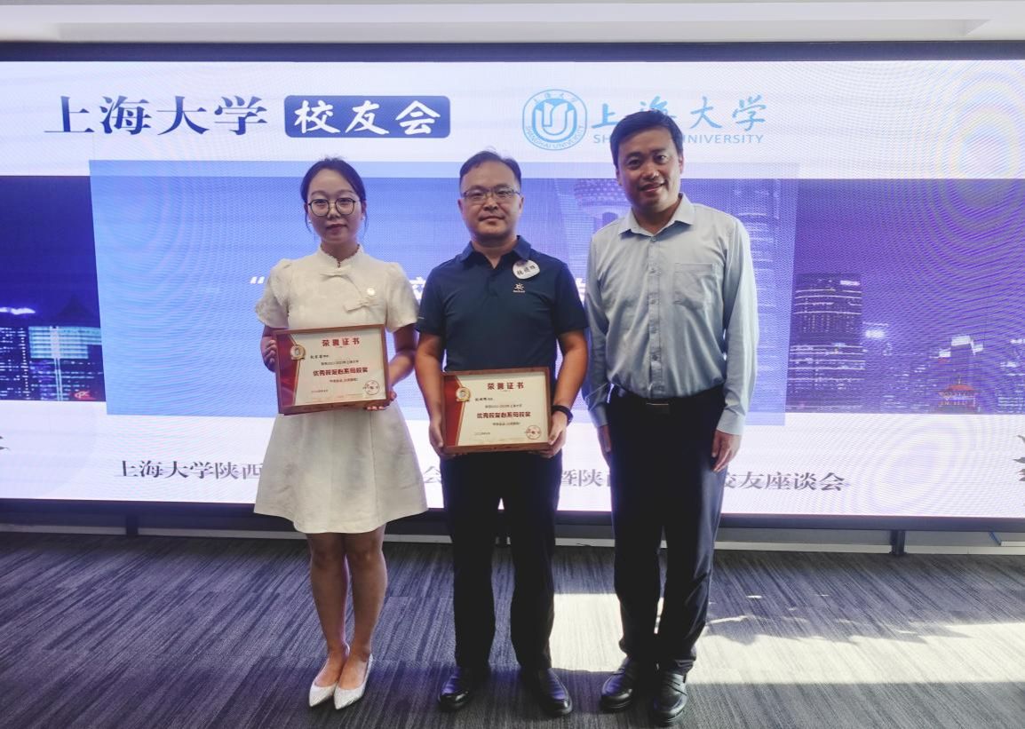 胡大伟为荣获“上海大学2022—2023年优秀校友—心系母校奖”的张朋辉、阮加苗两位校友颁发获奖证书。