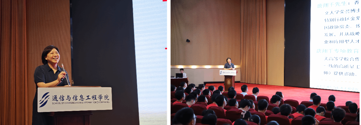 通信学院党委书记黄素娟老师系统详细地从翔英学院成立背景、办学特色、管理体制、培养模式等几个方面为新生们介绍了翔英学院的情况。翔英学院紧密依托上海大学通信学院,是上海大学实施工程教育改革和“卓越工程师教育培养计划”试点工作的重要基地。翔英学院的logo是一只飞翔的鹰,也是希望莘莘学子插上搏击长空的翅膀,成为翱翔的鹰!希望同学们能够志存高远、追求卓越、勤学多思、自强不息!