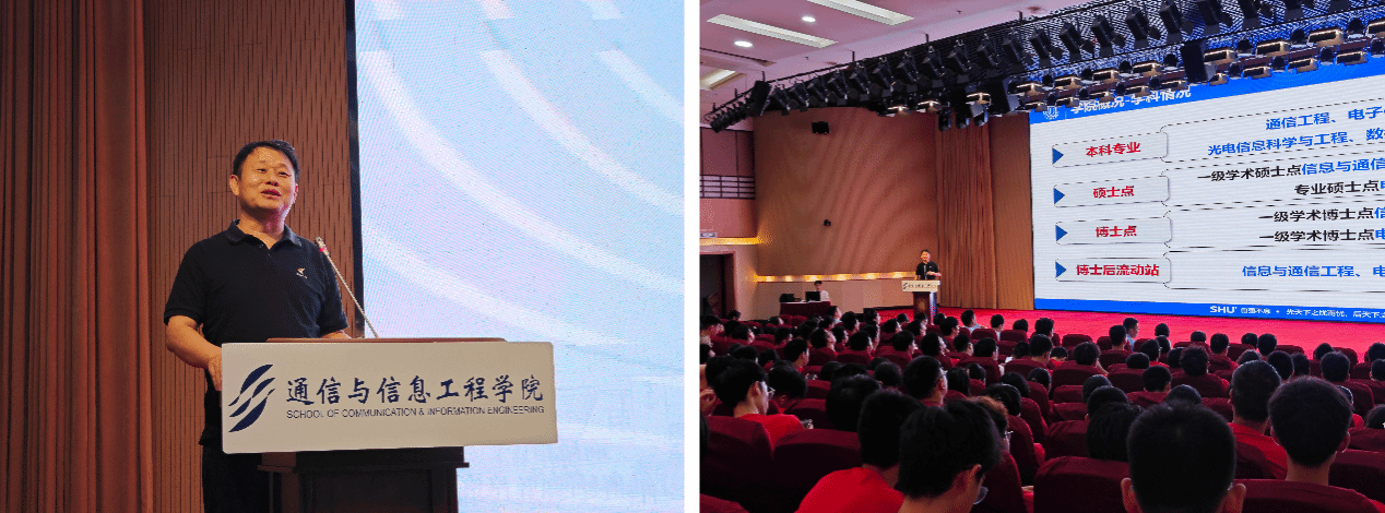 8月24日18:00,上海大学通信学院、翔英学院2024级本科新生见面会暨开学典礼在图书馆报告厅成功举行。通信学院党委书记黄素娟老师,院长、党委副书记庞拂飞老师,副院长金彦亮老师,新生班主任、辅导员与447位本科新生共同参会。见面会由院党委副书记、副院长陈涛老师主持。