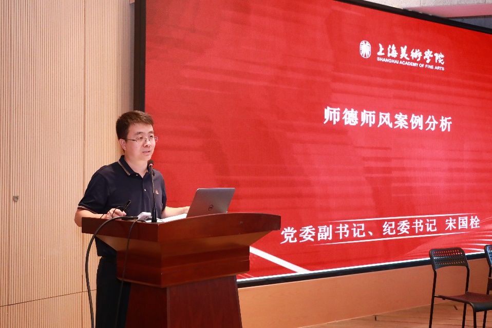 为深入学习贯彻党的二十大和二十届二中、三中全会精神,在迎接第40个教师节之际,上海大学上海美术学院以“大力弘扬教育家精神,加快建设教育强国”为主题,于9月6日上午开展2024年“师德师风建设月”活动暨教师思政工作会议。会议由学院党委副书记、纪委书记宋国栓主持,学院党政班子成员、各系部教师代表、新老教师结对代表等共计60余人参加。