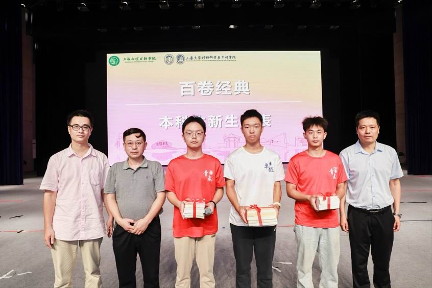 “百卷经典”是上海大学书院文化节的特色活动之一,三名本科生新生代表上台发言,分享自己进入大学以来的感受。生命科学学院党委书记陈付学,材料学院党委副书记、执行院长、日新书院院长钟云波,环境与化学工程学院副院长黄鑫为新生代表赠书,希望同学们通过广泛阅读书籍,厚植家国情怀,彰显时代担当,传承经典,筑梦未来。