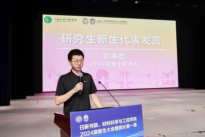 2024级博士研究生刘申哲作为研究生新生代表发言。作为本校推免的直博生,刘申哲感谢材料学院的培养,并表示在未来的学习生活中将继续秉持严谨求实的态度,感谢学院和老师们的悉心培养,并以校训“自强不息,道济天下”勉励新生,力争为材料科学的发展做出自己应有的贡献。