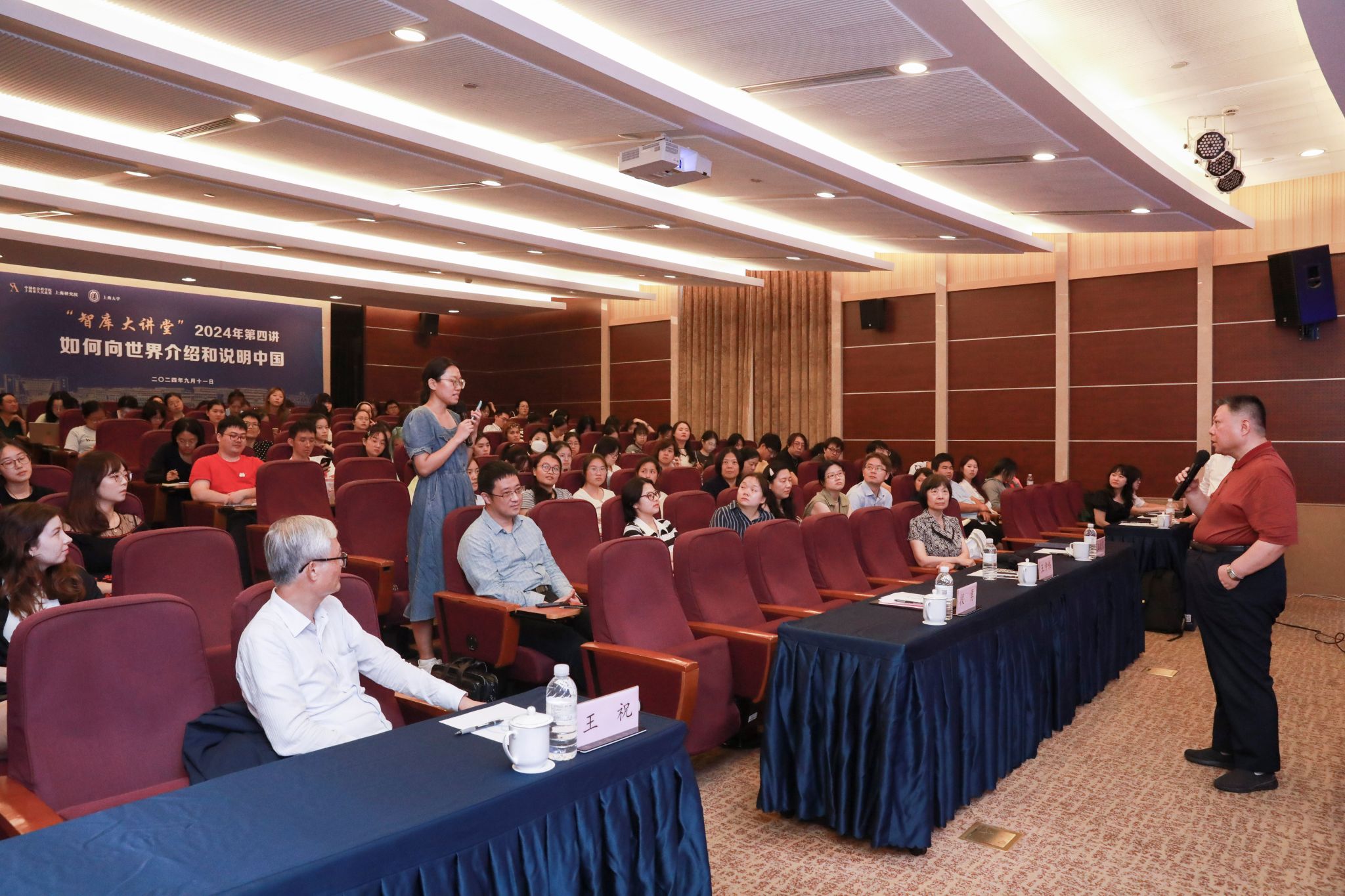 9月11日下午,由中国社会科学院-上海市人民政府上海研究院、上海大学主办,上海大学外国语学院承办的智库大讲堂2024年第四讲《如何向世界介绍和说明中国》在上海大学宝山校区乐乎新楼学海厅举行。讲座特邀原中共中央对外宣传办公室副主任王仲伟主讲,上海研究院常务副院长王晓霞,上海大学党委副书记段勇,日本一般社团法人日中发展协会副会长、上海大学上海合作组织公共外交研究院特聘研究员及法学院兼职教授王祝,外国语学院党政领导班子以及来自校内各相关部处学院和校外高校及科研院所等近150名师生、专家学者共同出席本次讲座。讲座由上海大学外国语学院院长尚新教授主持。