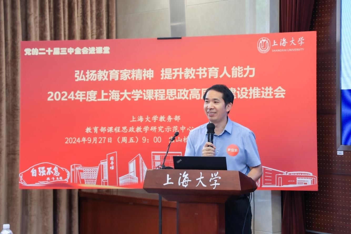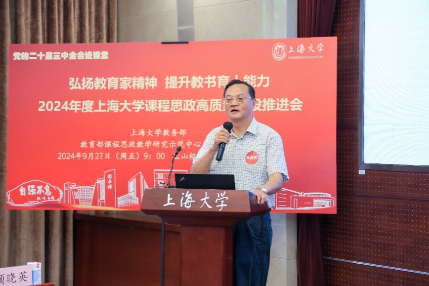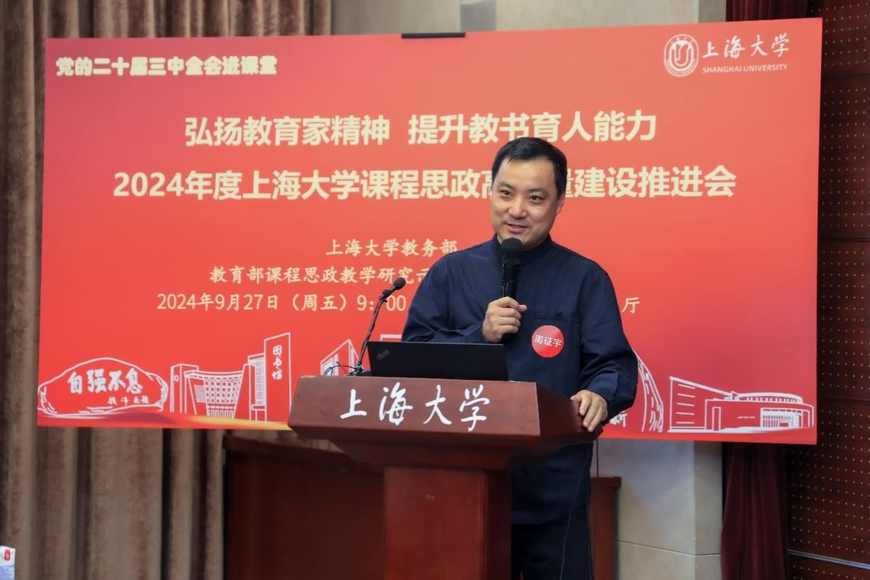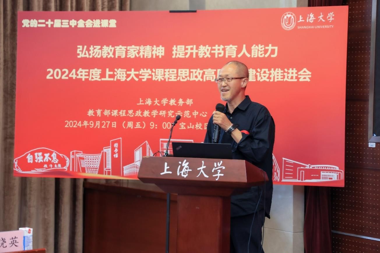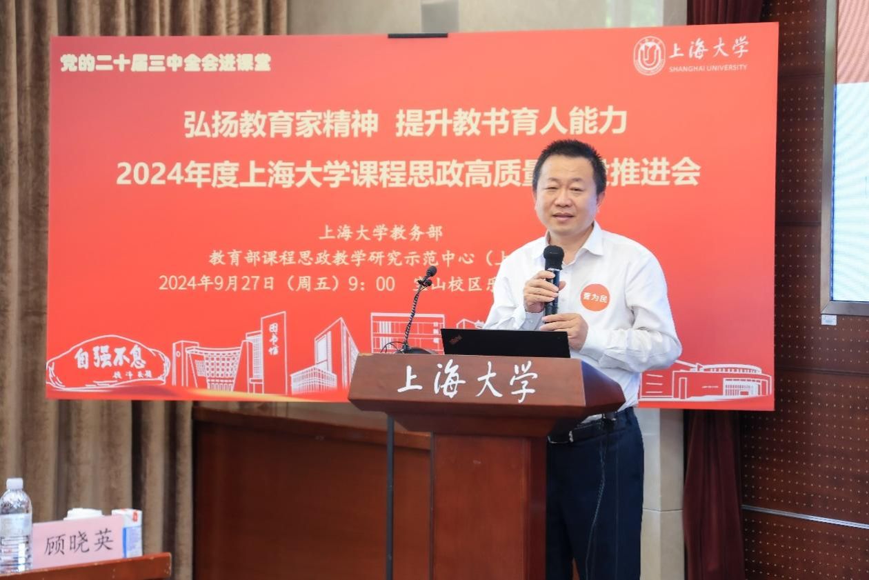 为进一步推动党的二十届三中全会精神进课堂,总结和展示上海大学今年课程思政建设教育教学成果,强化教育家精神引领,提升教师教书育人能力,9月27日上午,2024年度上海大学课程思政高质量建设推进会在上海大学宝山校区举行。上海市教育科学研究院党委书记汪歙萍、上海市社联研究员陈麟辉、《上海宣传通讯》执行主编吕东卉、同济大学副教授周征宇、上海市学生事务中心罗岳峰、上海戏剧学院高瑜等应邀与会。上海大学党委常委、副校长聂清,校党委常委、统战部部长、党委教师工作部部长曹为民,党委教师工作部副部长张富文,党委宣传部副部长、融媒体中心主任卢吉超,党政办副主任、法务办主任陈敬根,机关党委副书记郑亮,出版社社长余洋,研究生院王小丽等出席。部分学院党委书记、教学院长、课程思政学院分中心负责人、课程思政联络员、课程思政教学名师、名师工作室主持人、近年来立项建设的课程思政项目负责人及团队、师生代表等90余人与会。会议由上海大学教务部主办,教育部课程思政教学研究示范中心(上海大学)承办。教务部副部长、课程思政教学研究中心负责人顾晓英主持会议。