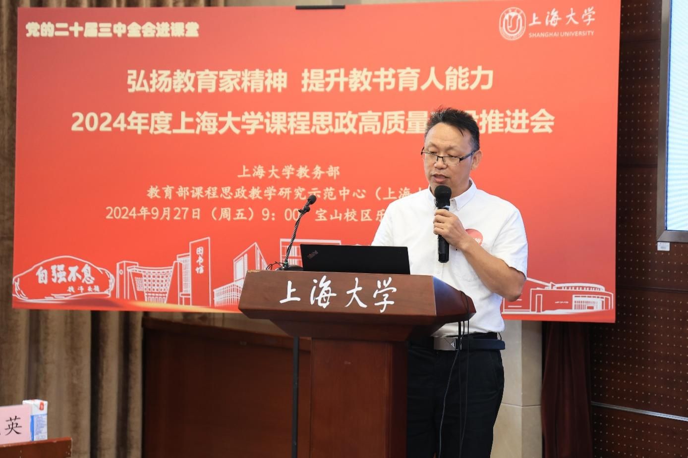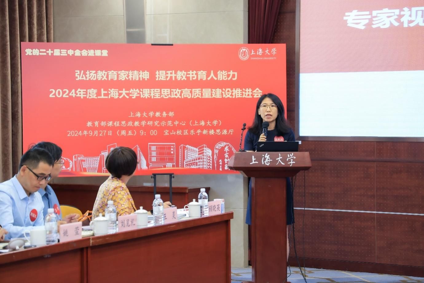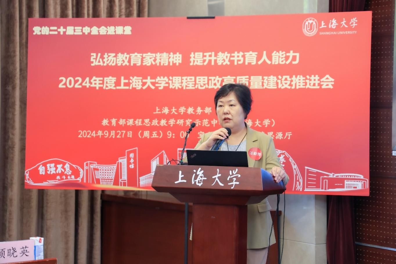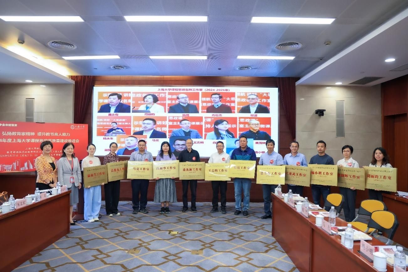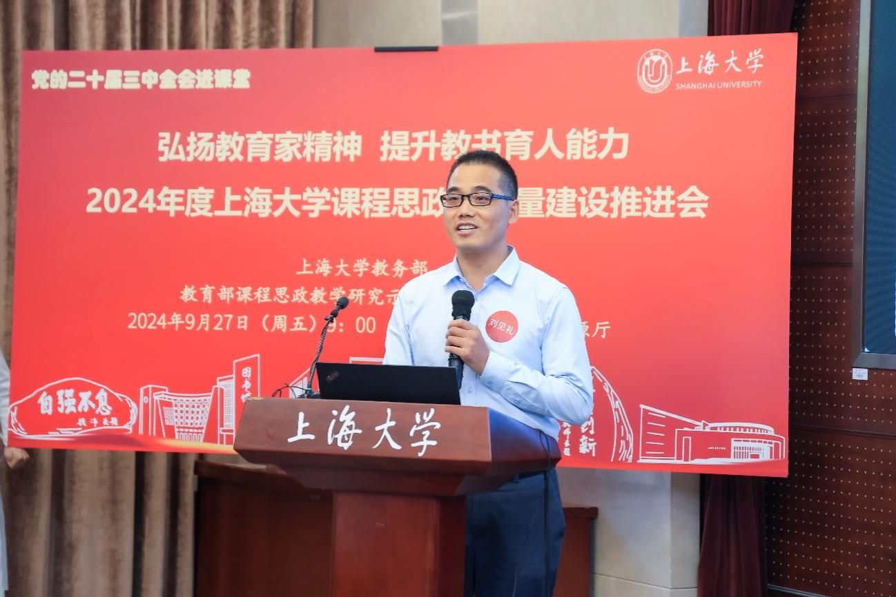 为进一步推动党的二十届三中全会精神进课堂,总结和展示上海大学今年课程思政建设教育教学成果,强化教育家精神引领,提升教师教书育人能力,9月27日上午,2024年度上海大学课程思政高质量建设推进会在上海大学宝山校区举行。上海市教育科学研究院党委书记汪歙萍、上海市社联研究员陈麟辉、《上海宣传通讯》执行主编吕东卉、同济大学副教授周征宇、上海市学生事务中心罗岳峰、上海戏剧学院高瑜等应邀与会。上海大学党委常委、副校长聂清,校党委常委、统战部部长、党委教师工作部部长曹为民,党委教师工作部副部长张富文,党委宣传部副部长、融媒体中心主任卢吉超,党政办副主任、法务办主任陈敬根,机关党委副书记郑亮,出版社社长余洋,研究生院王小丽等出席。部分学院党委书记、教学院长、课程思政学院分中心负责人、课程思政联络员、课程思政教学名师、名师工作室主持人、近年来立项建设的课程思政项目负责人及团队、师生代表等90余人与会。会议由上海大学教务部主办,教育部课程思政教学研究示范中心(上海大学)承办。教务部副部长、课程思政教学研究中心负责人顾晓英主持会议。