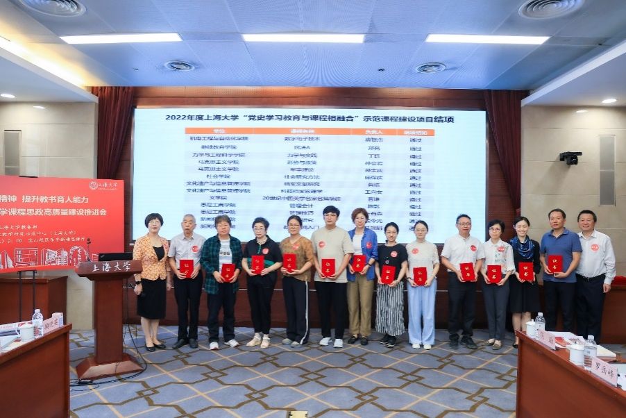 上海大学党委常委、副校长聂清为新一轮立项的上海大学课程思政名师工作室授铜牌。