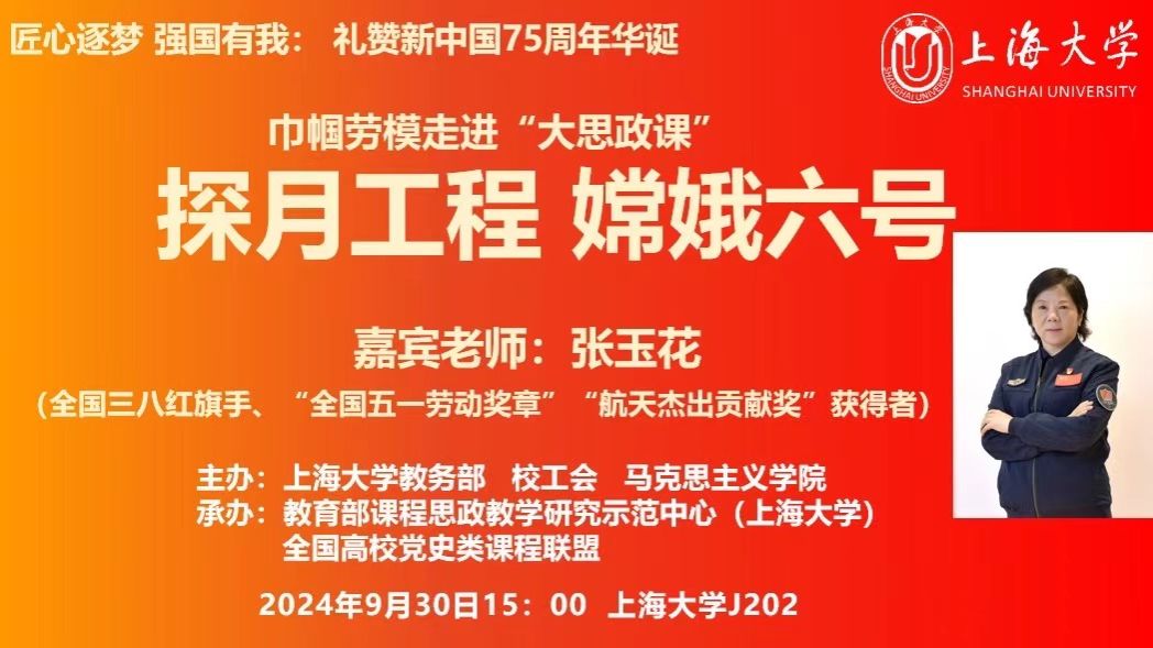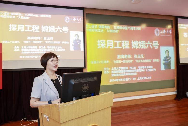 为深入学习贯彻党的二十届三中全会精神,喜迎新中国成立75周年,弘扬探月精神,9月30日下午,上海大学“巾帼劳模走进大思政课”活动在宝山校区J202举行。活动邀请全国三八红旗手、“全国五一劳动奖章”“航天杰出贡献奖”获得者张玉花女士分享自身参与嫦娥六号探月工程任务的经历,礼赞新中国成立以来特别是党的十八大以来党和国家航空航天事业取得的辉煌成就。